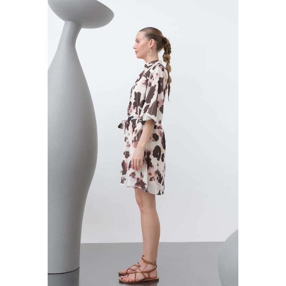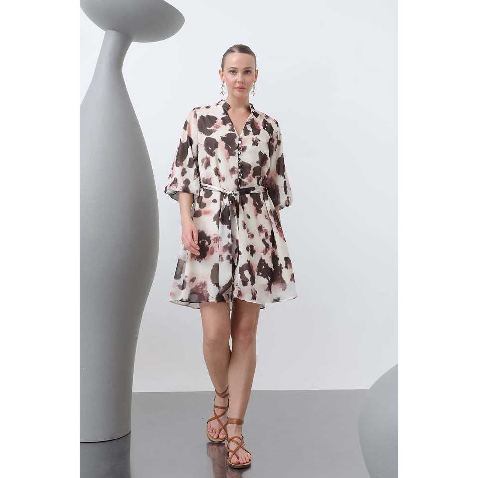 เดรสชีฟองผู้หญิงทรงห่อแบบหรูหรา สีเบจน้ำตาลเข้ม คอทรงโอ เอวธรรมชาติ สไตล์ค็อกเทล ระบายอากาศได้ดี ชุดเดรสสั้น