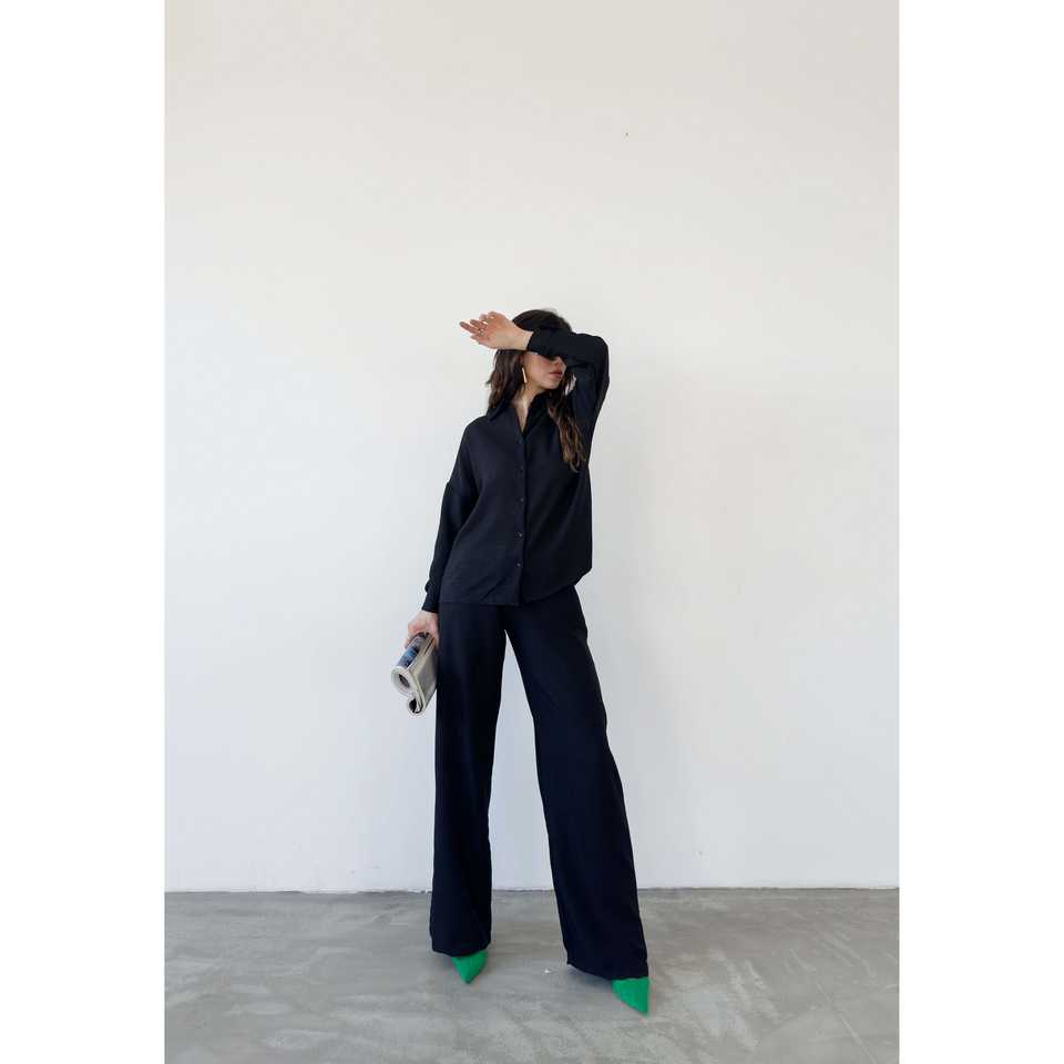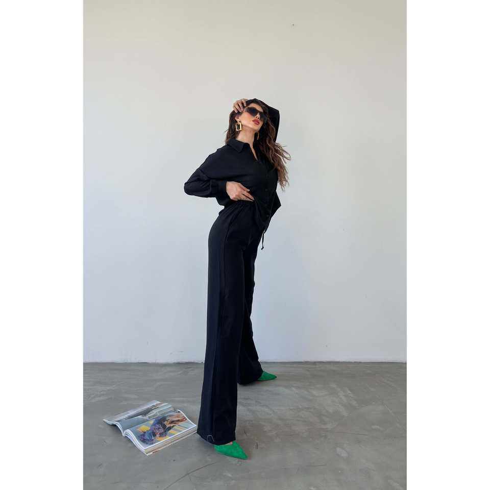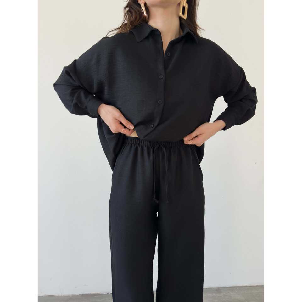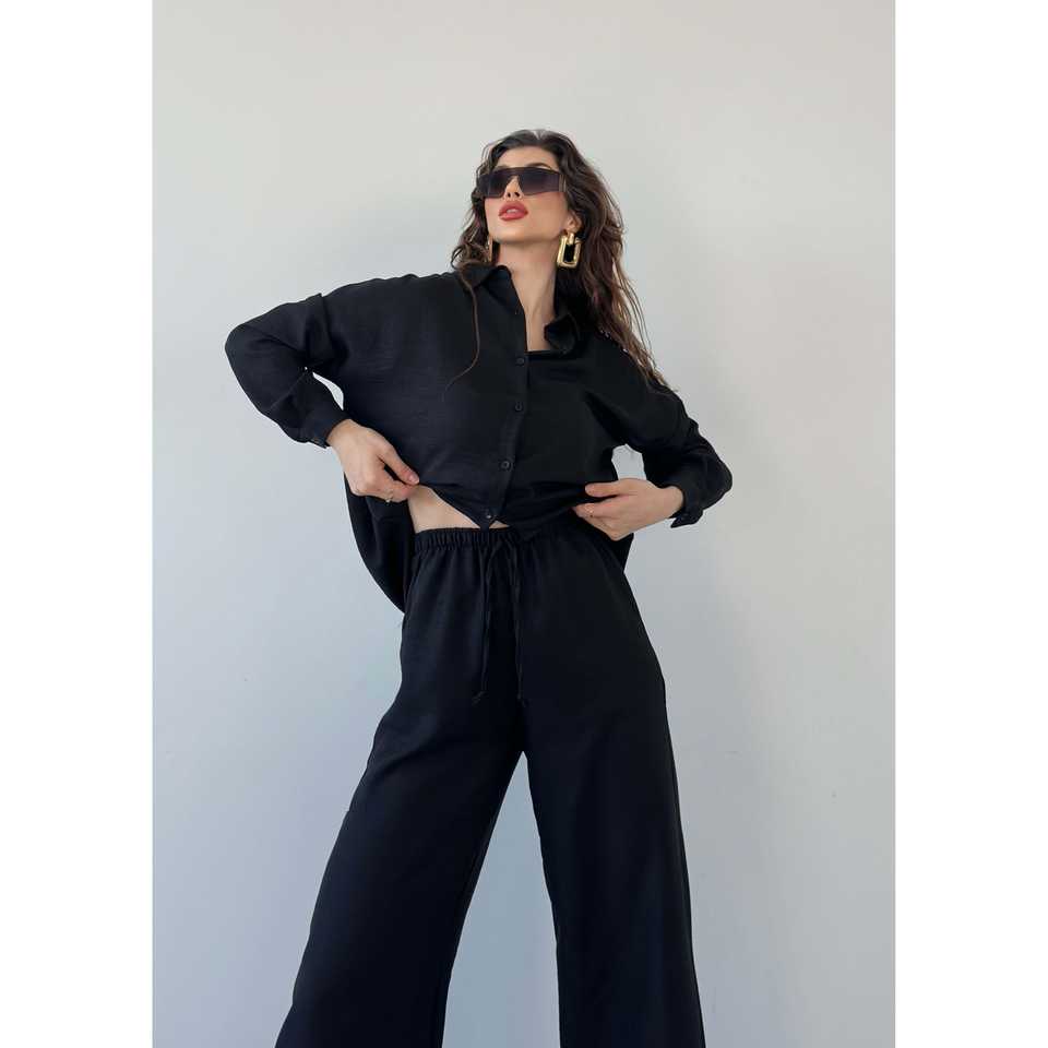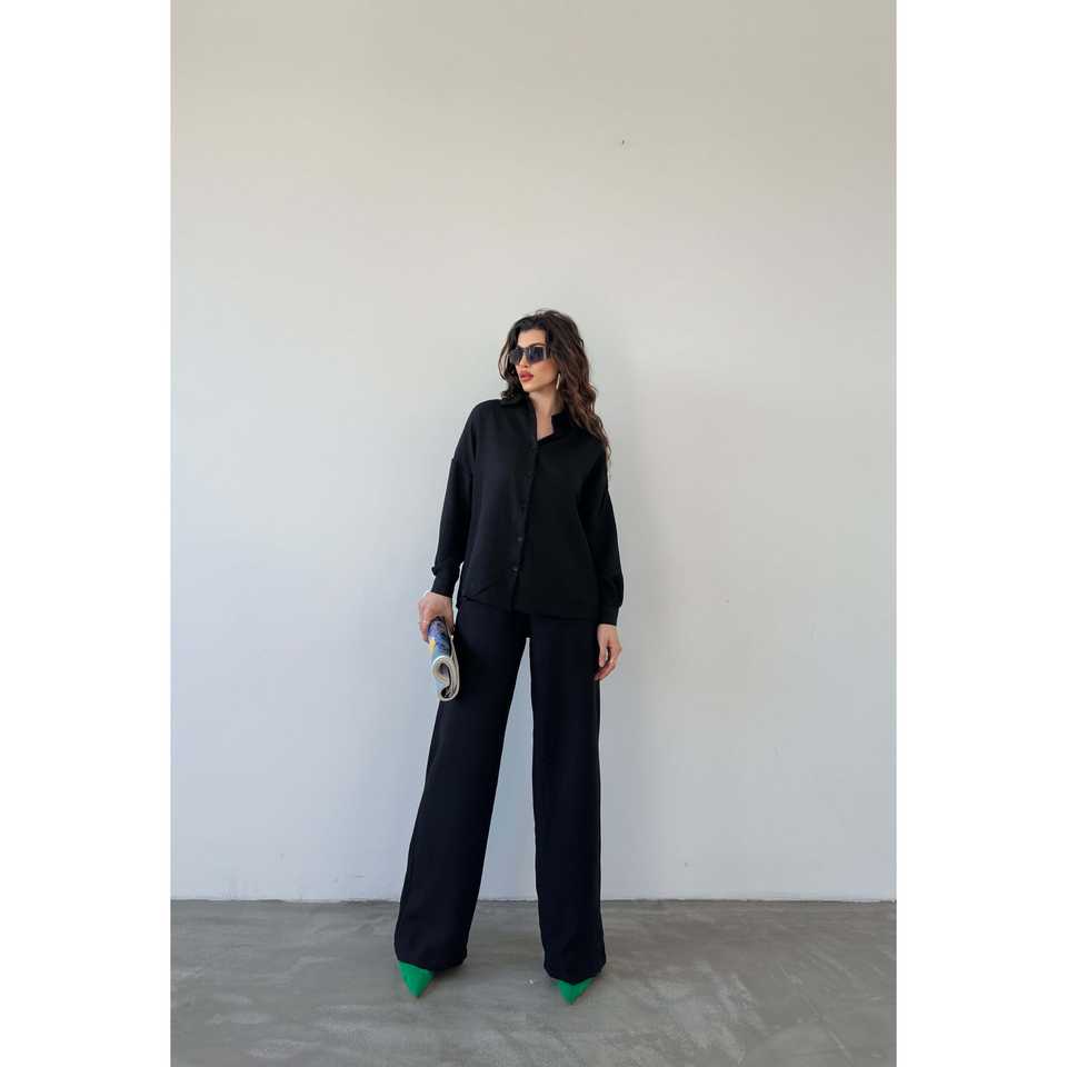 ชุดเสื้อและกางเกงเครปผู้หญิงสุดหรู 2 ชิ้น แขนยาว สีดำ ชุดลำลองสำหรับใส่ในชีวิตประจำวัน
