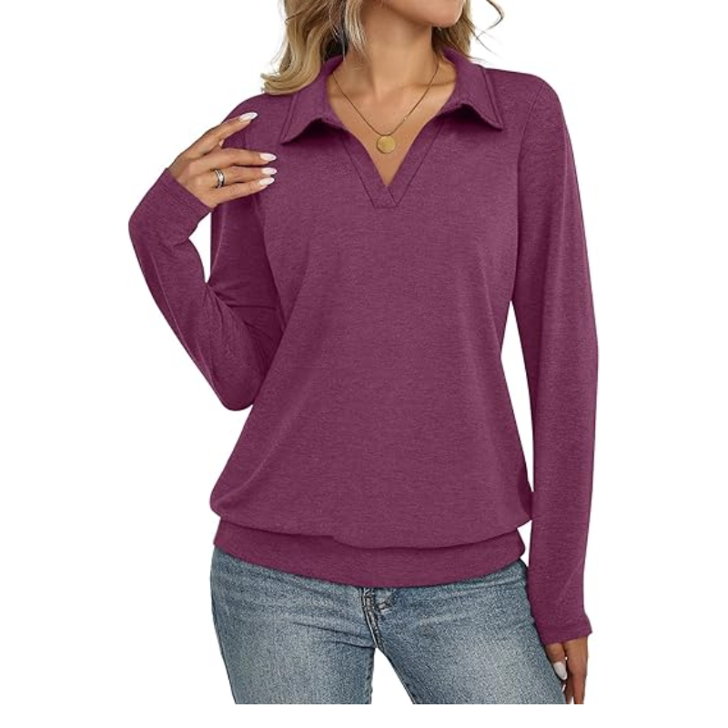Elegant Women's Long Sleeve for Polo Shirts Banded Bottom V Neck Work Tops Breathable Knitted Fabric Short Printed Blank Logo