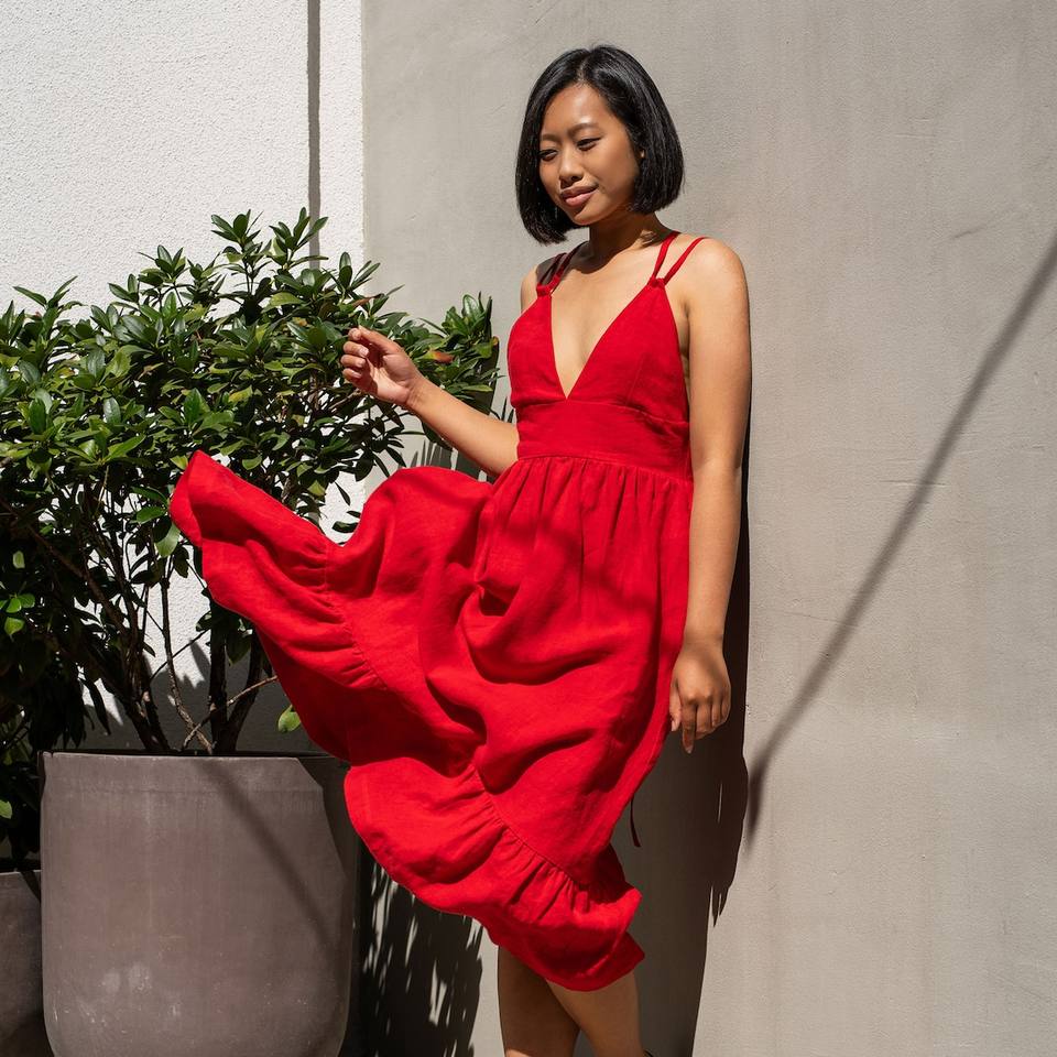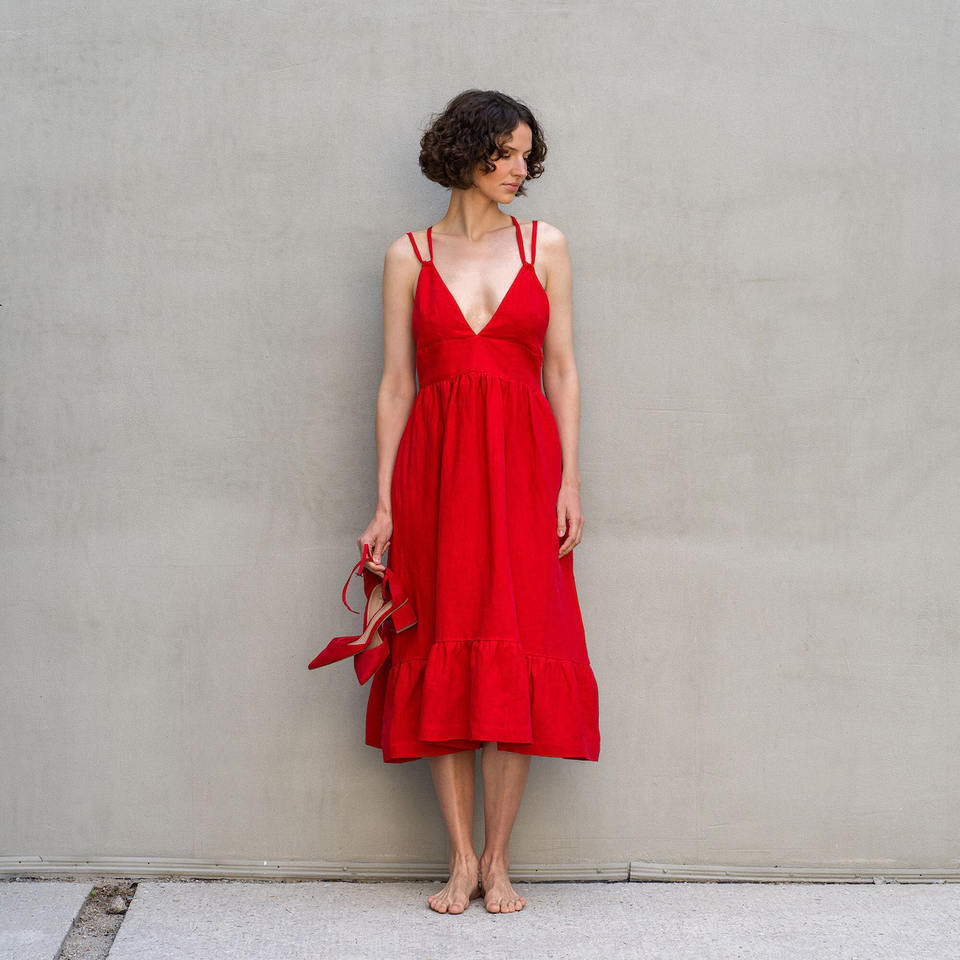 ชุดแม็กซี่เดรสคอวีแขนกุดสีแดงสำหรับผู้หญิงหรูหราสำหรับงานปาร์ตี้ผ้าลินิน100% ทอรอบเอวธรรมชาติย้อมสีล้วน