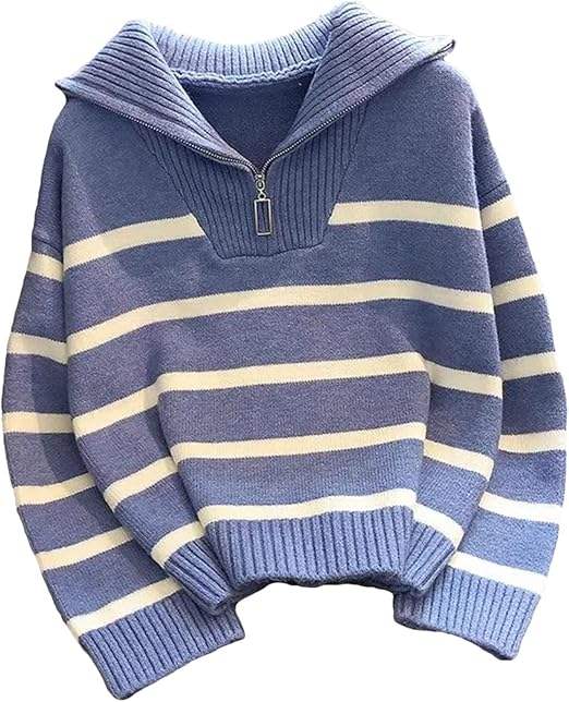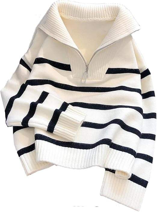 เสื้อสเวตเตอร์ถักแบบสวมศีรษะมีซิปแนววินเทจของผู้หญิงเสื้อสเวตเตอร์ถักลายทางแขนสั้นทรงหลวมโลโก้ด้านหน้าสำหรับฤดูใบไม้ร่วง