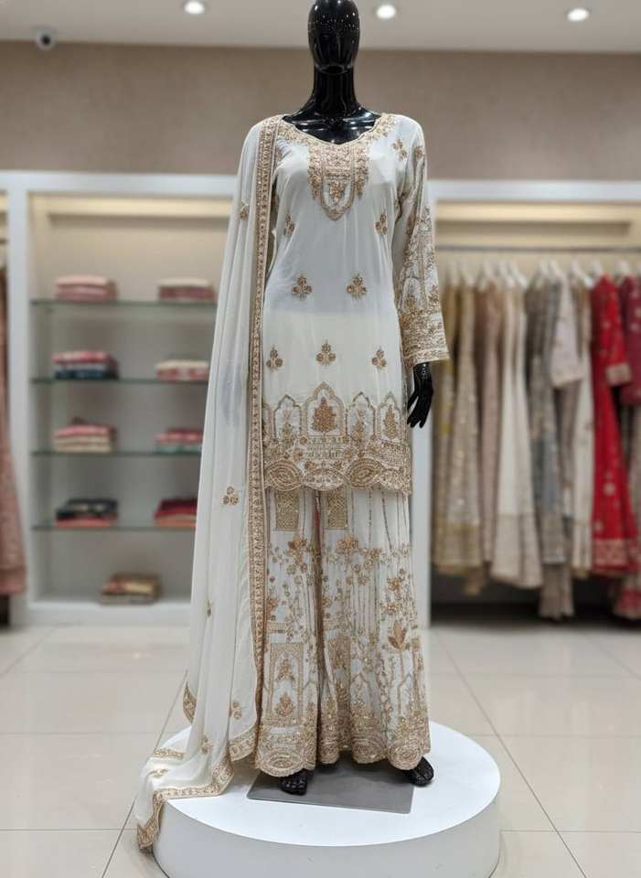 ชุดชาราร่าผ้าจอร์เจตต์สีขาวสำหรับผู้หญิง ดีไซน์หรูหรา ปักลายหนักแน่น สไตล์อันตราไลฟ์สไตล์ ผ้าไม่ยับ แห้งเร็ว ป้องกันแสงแดด