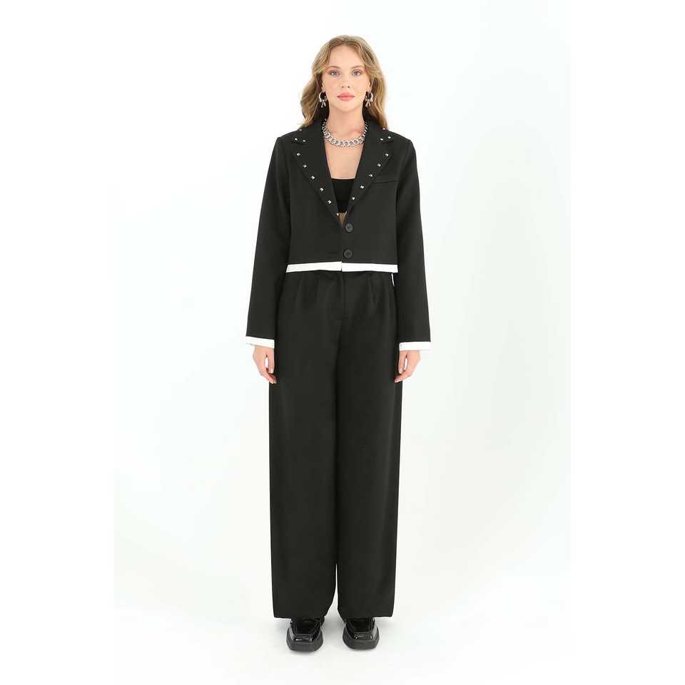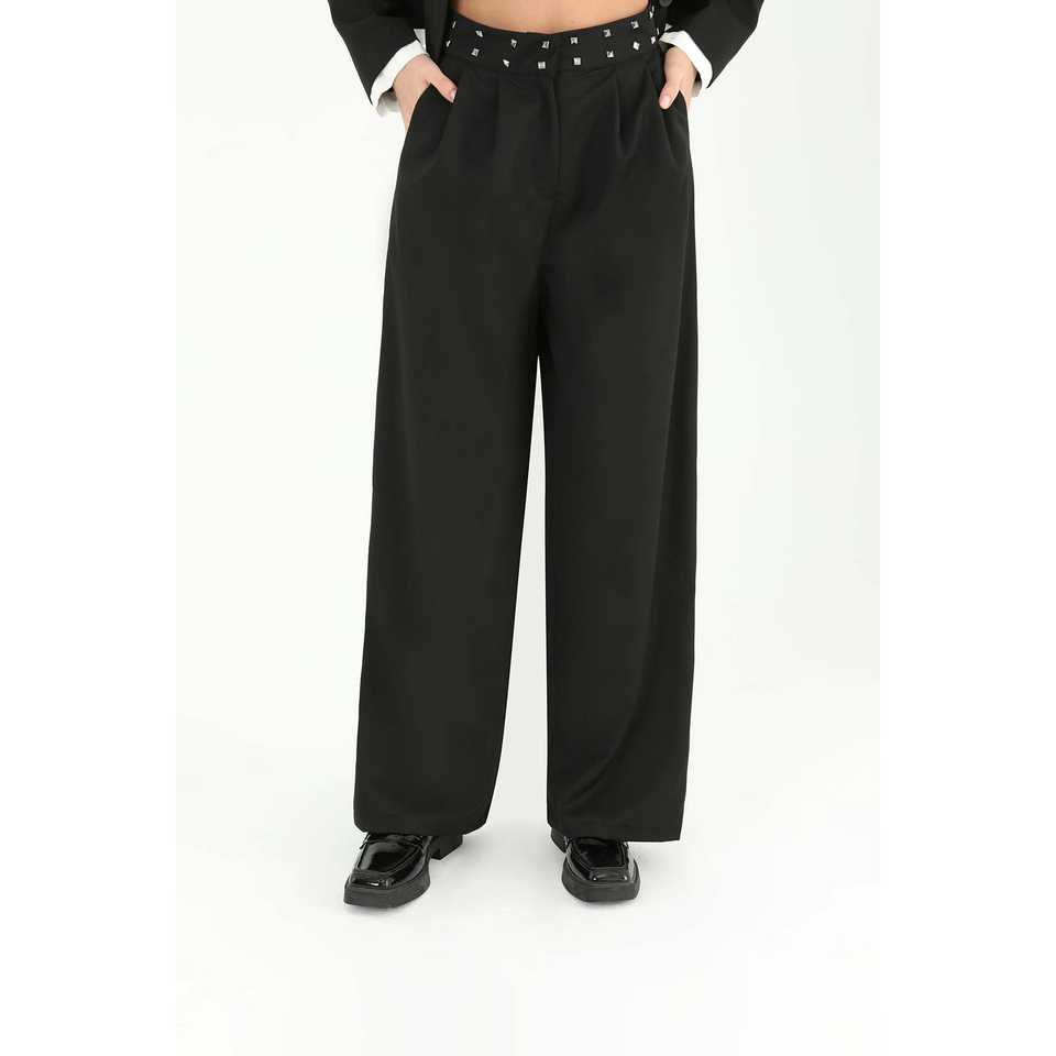 กางเกงขายาวทรงกว้างเอวสูงผ้าซาตินสีดำสำหรับผู้หญิง ดีไซน์หรูหรา ผ้าไม่ยับ จับจีบ