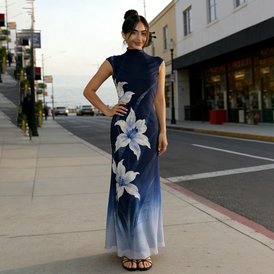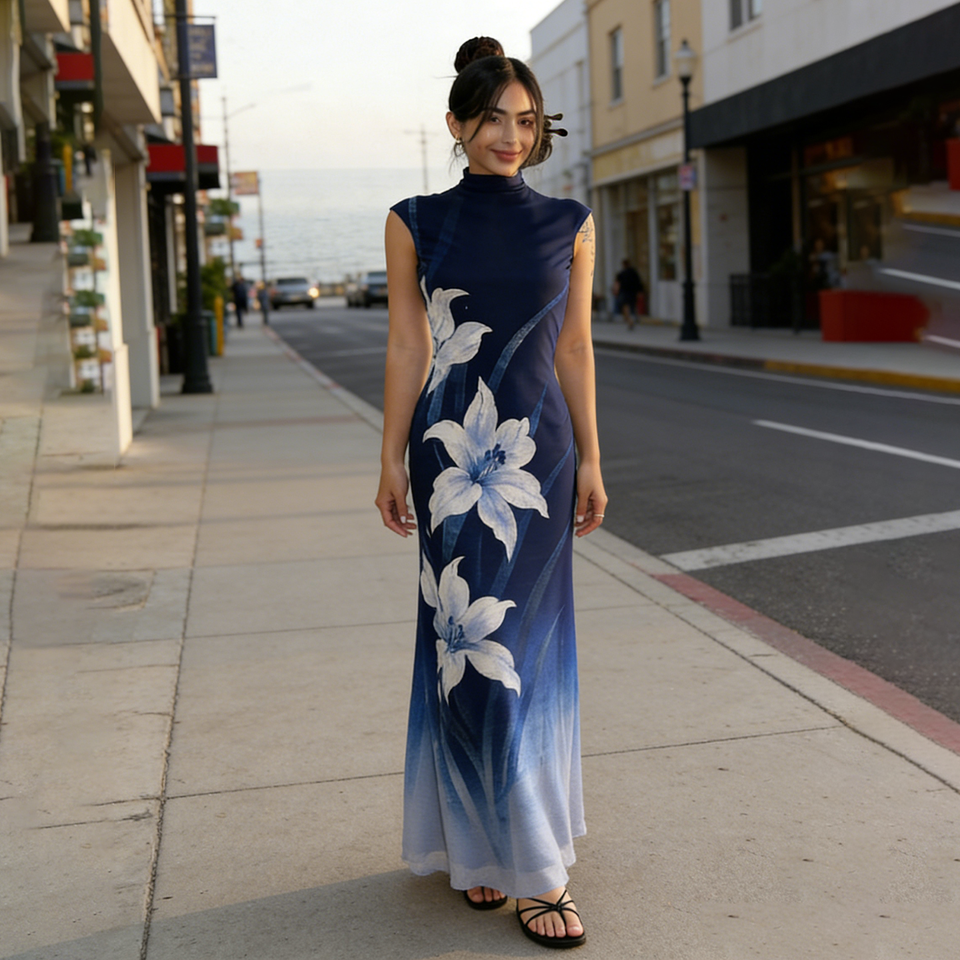 เดรสยาวผู้หญิงผ้าตาข่ายยืดหยุ่น ดีไซน์หรูหรา ลายพิมพ์ดอกไม้ไล่เฉดสี คอสูง แขนกุด ผ้าบางเบา ซ้อนชั้นๆ สไตล์ลำลอง