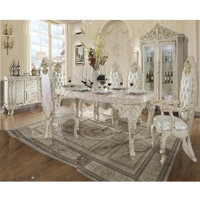 ชุดเฟอร์นิเจอร์รับประทานอาหารไม้แกะสลักสีขาวสุดหรู ชุดโต๊ะรับประทานอาหารไม้คลาสสิกและงานฝีมือสุดหรู ซื้อชุดเฟอร์นิเจอร์ห้องรับประทานอาหารจากสหรัฐอเมริกา