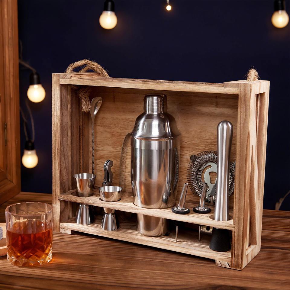 ชุดอุปกรณ์บาร์สแตนเลสพร้อมที่วางไม้สุดหรู เหมาะสำหรับบาร์ที่บ้าน วิสกี้ ไวน์ ค็อกเทล อุปกรณ์เสริมที่ทนทาน สวยงาม ใช้งานได้ดี
