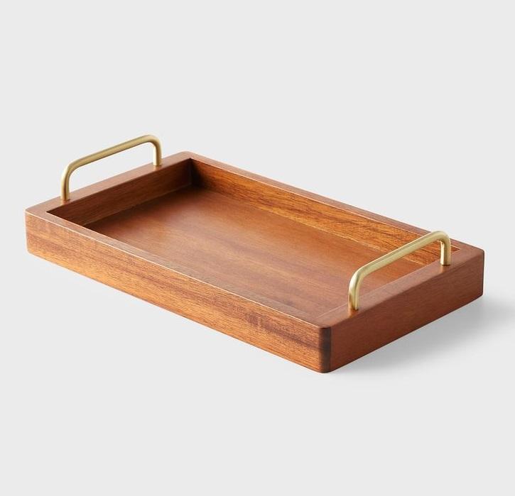 ถาดเสิร์ฟทรงสี่เหลี่ยมผืนผ้าดีไซน์หรูหรา ทำจากไม้เคลือบสีน้ำตาลเข้ม พร้อมหูจับทองเหลือง สำหรับใช้รับประทานอาหาร