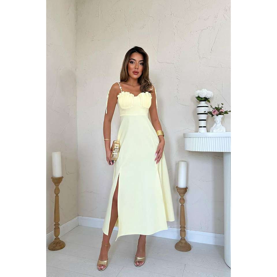 ชุดราตรีผ้าซาตินสีเหลืองหรูหรา คอรูปหัวใจ ทรงเข้ารูป พร้อมดีเทลผ่าข้าง เอวทรงธรรมชาติ