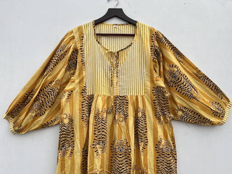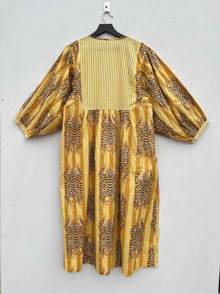 เดรสผ้าฝ้ายพิมพ์ลายเสือดาวสีเหลืองลายทางสุดหรู แขนพอง ความยาวปานกลาง เป็นมิตรกับสิ่งแวดล้อม ซักได้ สไตล์สตรีทแวร์ทันสมัย