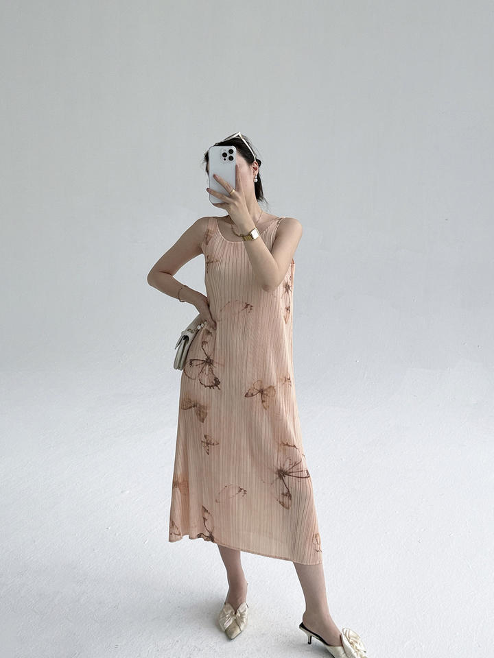Elegant and Fashionable Women's Midi Pleated Dress with Sleeveless Ruched Geometric Pattern Formal Clothing Woven