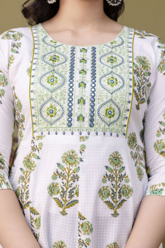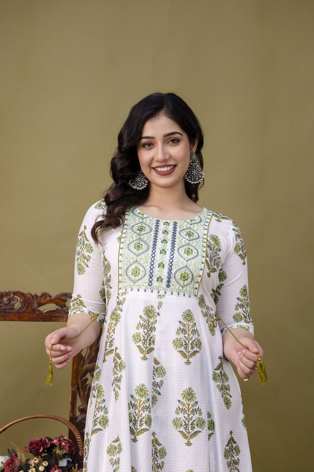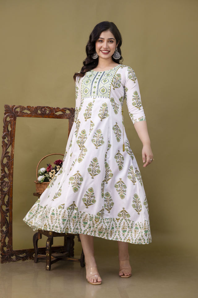 ชุดอานาร์กาลีสีงาช้าง สง่างามและมีเสน่ห์ แขนสามส่วน คอทรงกลม เหมาะสำหรับงานกลางวัน งานเฉลิมฉลอง หรือสวมใส่ในโอกาสทางวัฒนธรรม