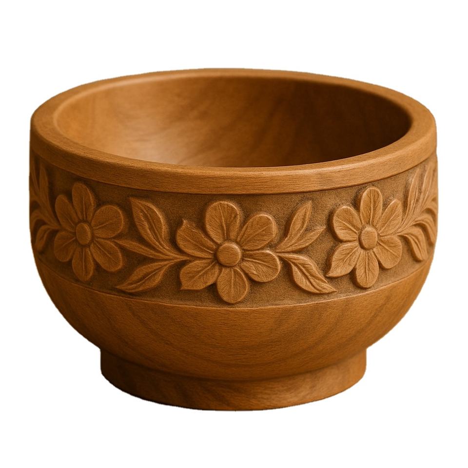 ชามไม้แกะสลักที่สง่างามพร้อมลวดลายดอกไม้นูนและโทนสีอบอุ่นเหมาะสำหรับการตกแต่งชิ้นกลางผลไม้แห้งหรือใช้ในเทศกาล
