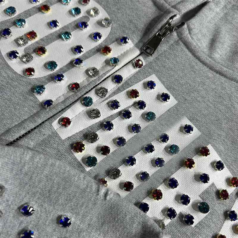 ชุดวอร์มคริสตัลพลอยเทียมแบบกำหนดเองหรูหรามีรายละเอียดหินสีสดใสระบายอากาศได้ดีดีไซน์เพรียวบาง