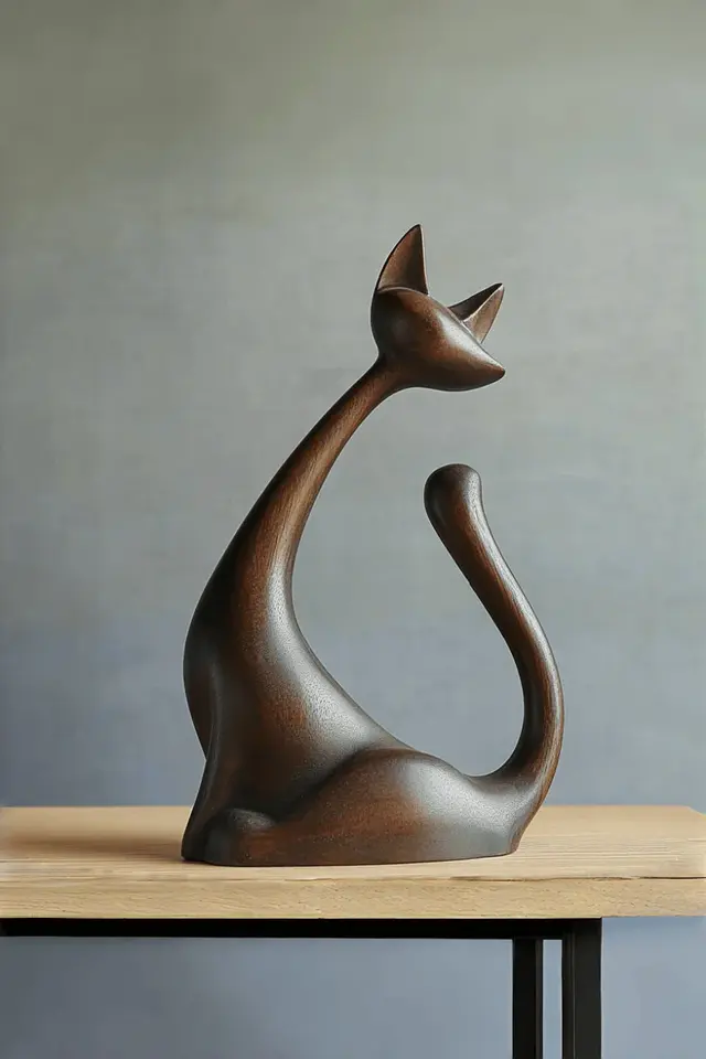 งานประติมากรรมแมวไม้ดีไซน์หรูหรา ตกแต่งบ้านสไตล์มินิมอลสมัยใหม่ แกะสลักด้วยมือ รูปปั้นไม้โค้งมนเรียบเนียน ของตกแต่งบ้านที่มีศิลปะสำหรับวางบนโต๊ะ
