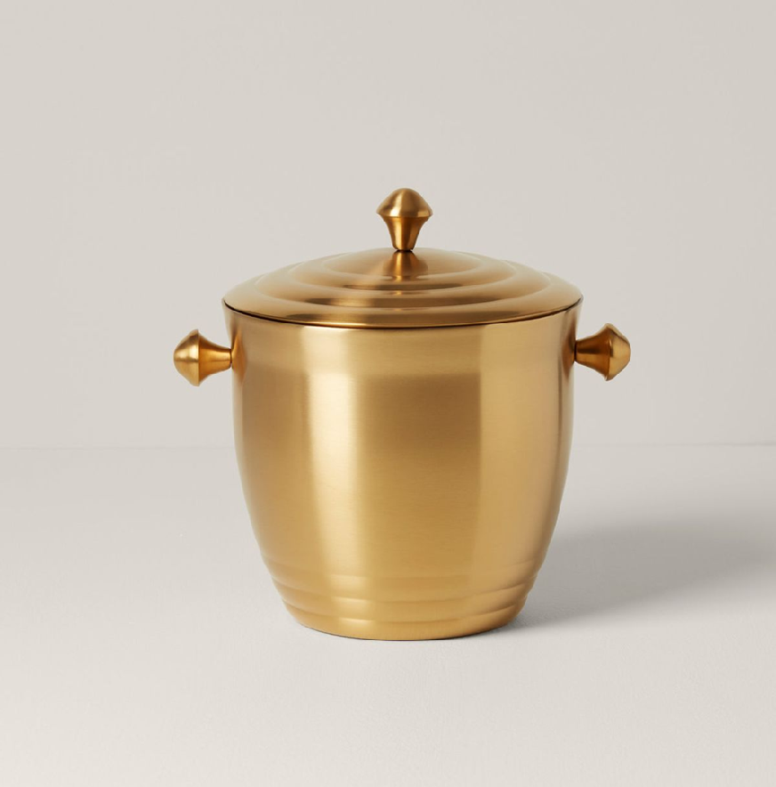 ถังน้ำแข็งโลหะสีทองขัดเงา ดีไซน์หรูหรา พร้อมฝาปิดและหูจับด้านข้างที่เข้าชุดกัน มีจำหน่ายในราคาขายส่ง