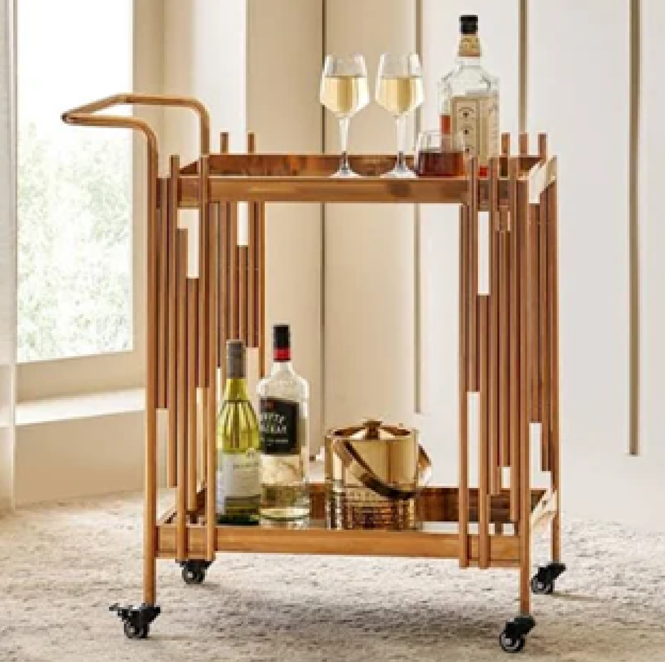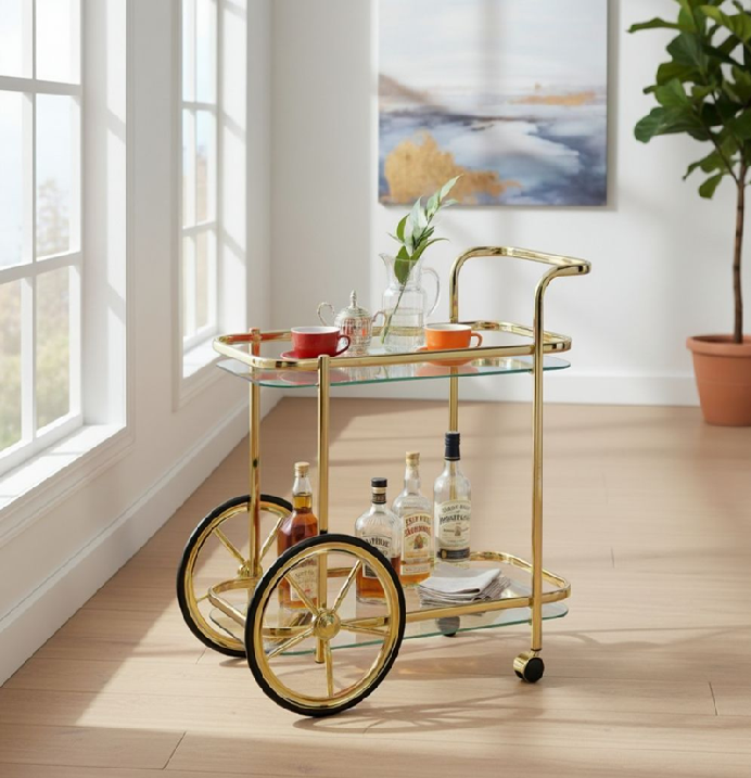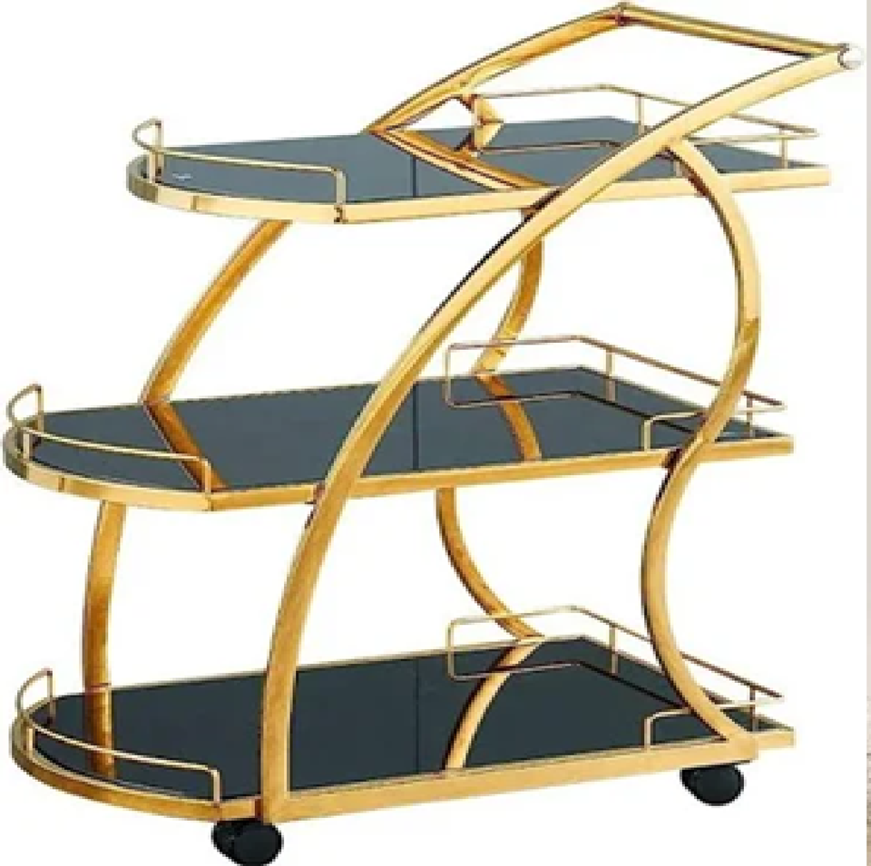 รถเข็นสามชั้นแบบโค้งโลหะสีทองหรูหราชั้นวางแก้วสีดำดีไซน์รถเข็นบาร์หรูหราจำหน่ายในราคาขายส่ง