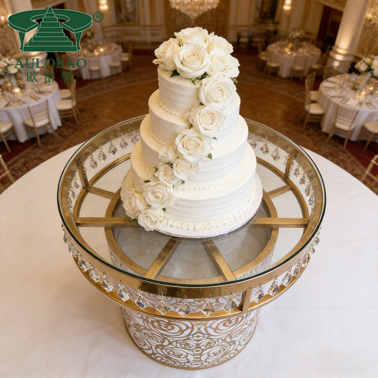 โต๊ะเค้กแต่งงานทรงสูง โครงสแตนเลสสตีลหรูหรา ประดับคริสตัลรูปดอกกุหลาบ
