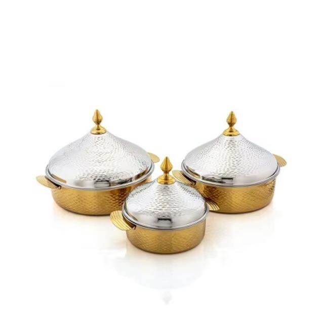 ชุดหม้อโลหะ 3 ใบ สีเงิน ให้ความอบอุ่นและดูหรูหรา ช่วยรักษาความร้อนได้ดีเยี่ยม เหมาะสำหรับการรับประทานอาหารนอกบ้านหรือร่วมกัน