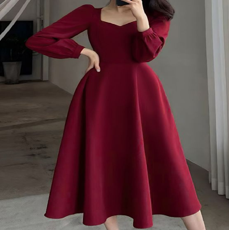 เดรสทรงเอไลน์สีแดงไวน์สุดหรู แขนยาว คอวีทรงหวาน เหมาะสำหรับใส่ไปงานปาร์ตี้ มีจำหน่ายในราคาขายส่ง