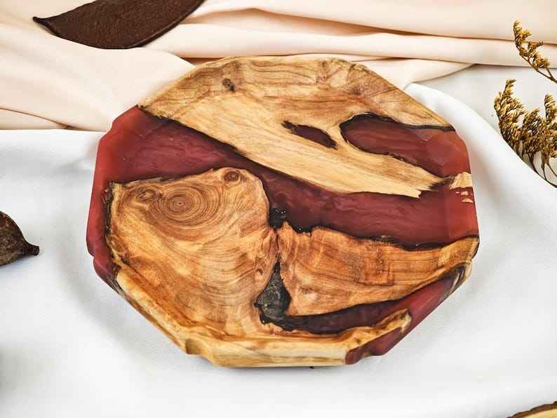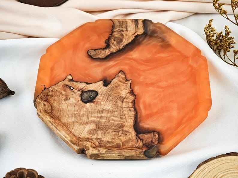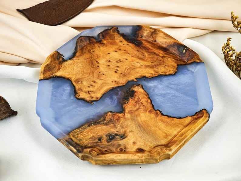 แผ่นไม้และเรซินที่หรูหราผสมผสานเสน่ห์ของธรรมชาติเข้ากับสไตล์ทันสมัยเหมาะสำหรับการเสิร์ฟอาหารหรือการตกแต่ง