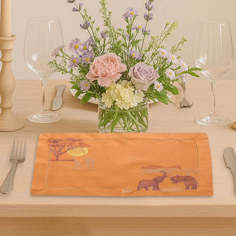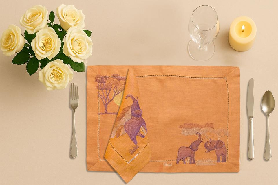 แผ่นรองจานผ้าลินินลายช้าง – แผ่นรองจานทำจากผ้าลินินธรรมชาติ 100% เป็นมิตรกับสิ่งแวดล้อม ใช้ซ้ำได้ สำหรับใช้ในบ้าน