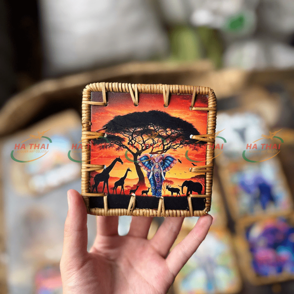 แผ่นรองจานหวายสี่เหลี่ยมลายช้างสัตว์ป่าวัสดุไม้ไผ่รักษาความร้อน