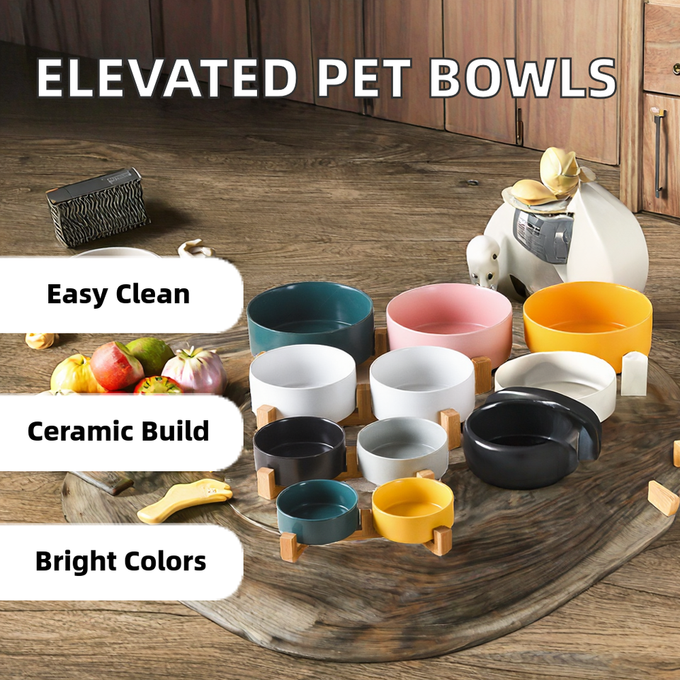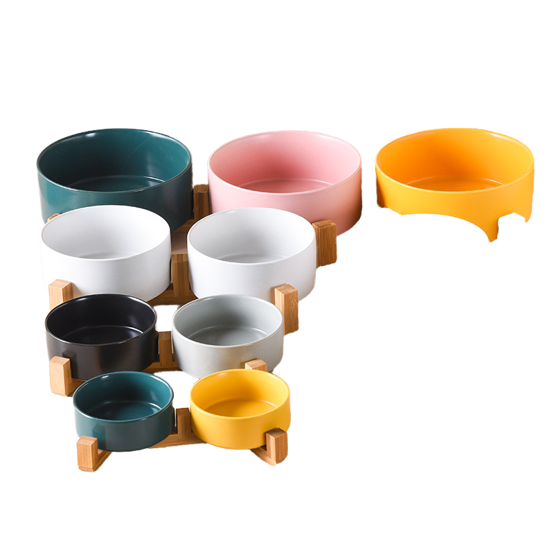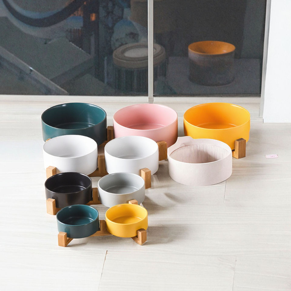 ชามอาหารแมวเซรามิกแบบยกสูงพร้อมขาตั้งไม้ไผ่ธรรมชาติ ชุดให้อาหารคู่ สำหรับแมวในบ้าน สัตว์เลี้ยงขนาดเล็ก ขายส่ง
