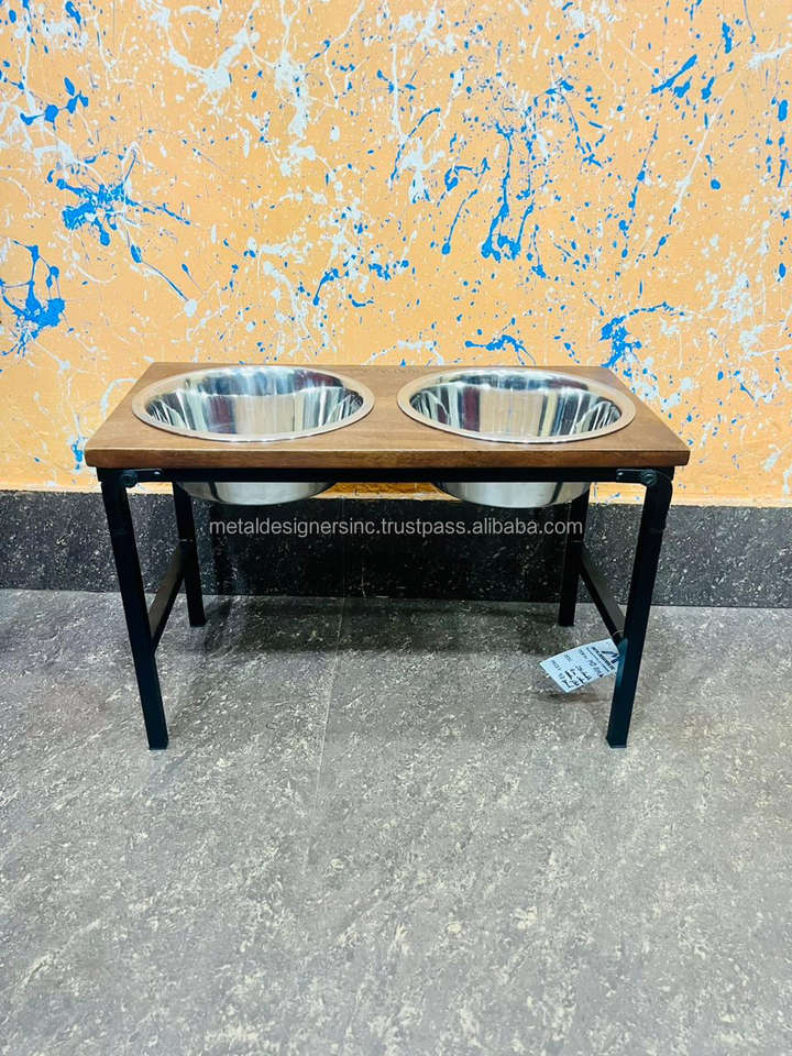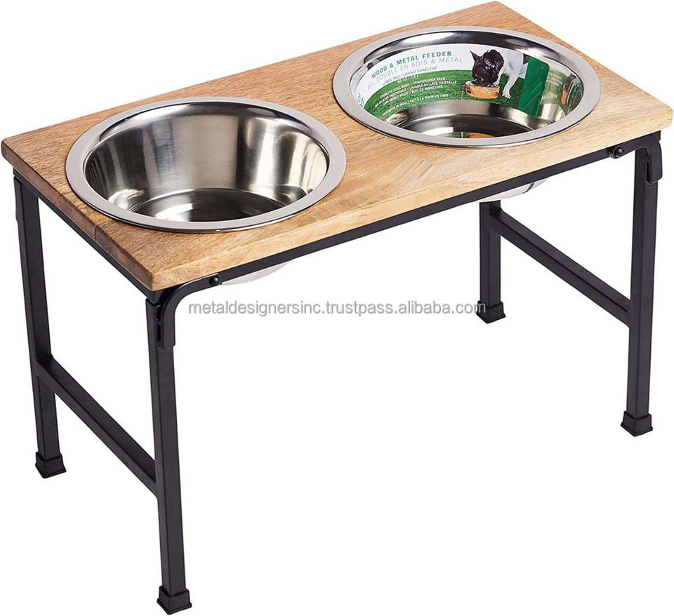 ตัวป้อนอาหารสุนัขสองชั้นพับได้ทำจากสแตนเลสสูงพร้อมท่อโลหะขาตั้ง k/d และแผ่นไม้ด้านบนแตกต่างกันสำหรับการทำอาหาร