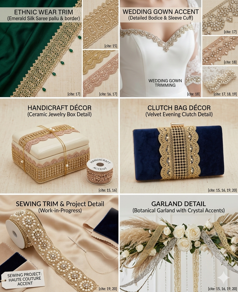 คอลเลกชันลูกไม้ตกแต่งทำมือระดับพรีเมียม ขอบผ้าปักดิ้นโลหะคุณภาพสูง ประดับด้วยคริสตัลตัดแต่งอย่างประณีต