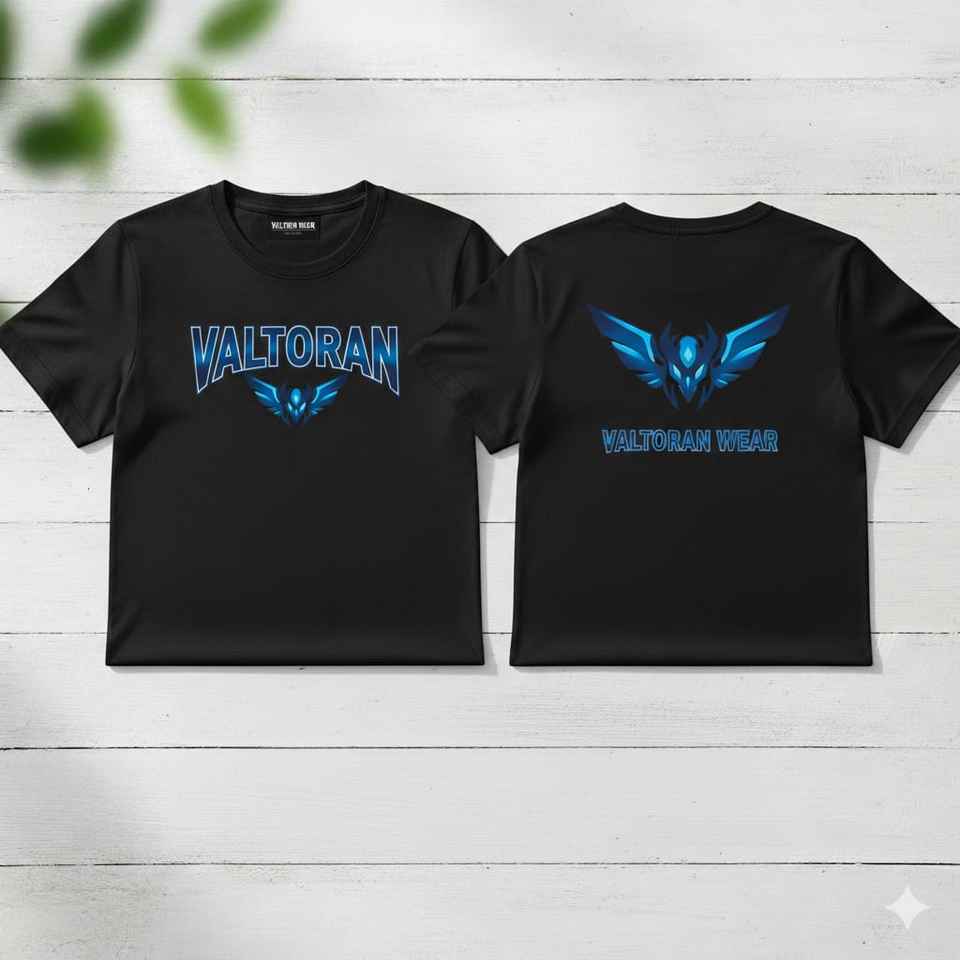 เสื้อยืด Elite Valtoran Signature – ผ้าฝ้ายสีดำเนื้อหนาคุณภาพพรีเมียม พร้อมลายกราฟิกสีน้ำเงินนีออนและตราสัญลักษณ์แบรนด์