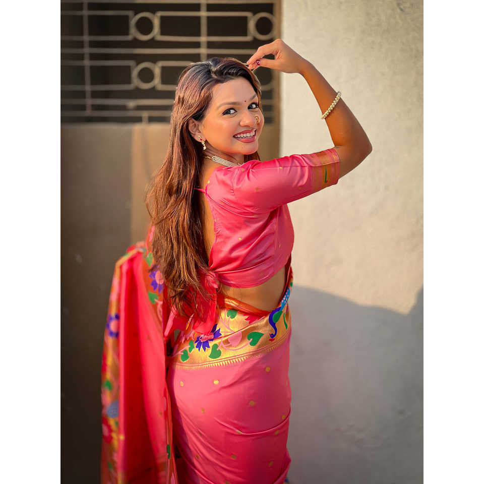 ผ้าซารีสีชมพูอ่อนลายทอแบบ Zari ของ Elite Weaves ขอบผ้าขนาดใหญ่ ผ้าไหม Paithani แบบสองด้าน ป้องกันแสงแดด แห้งเร็ว สำหรับผู้หญิงชาวอินเดีย