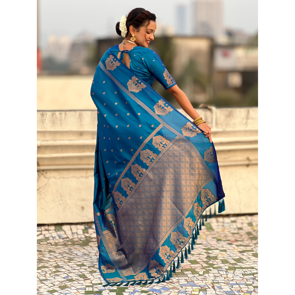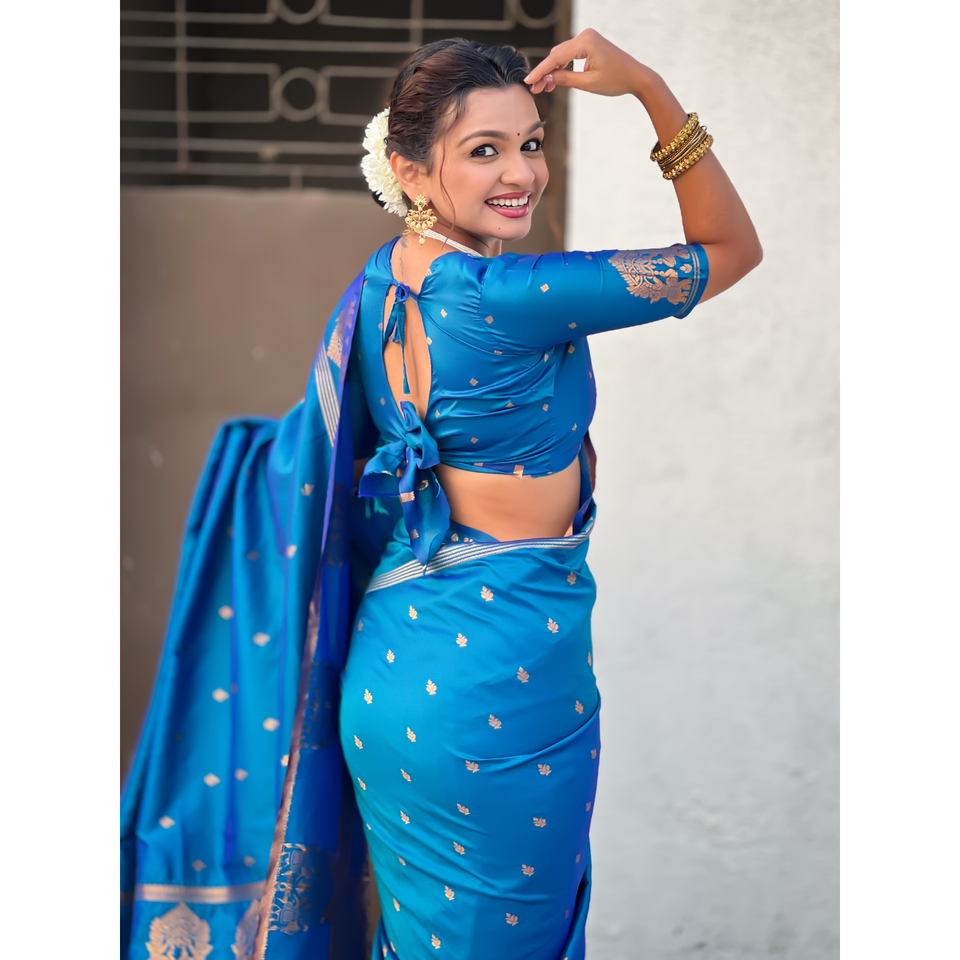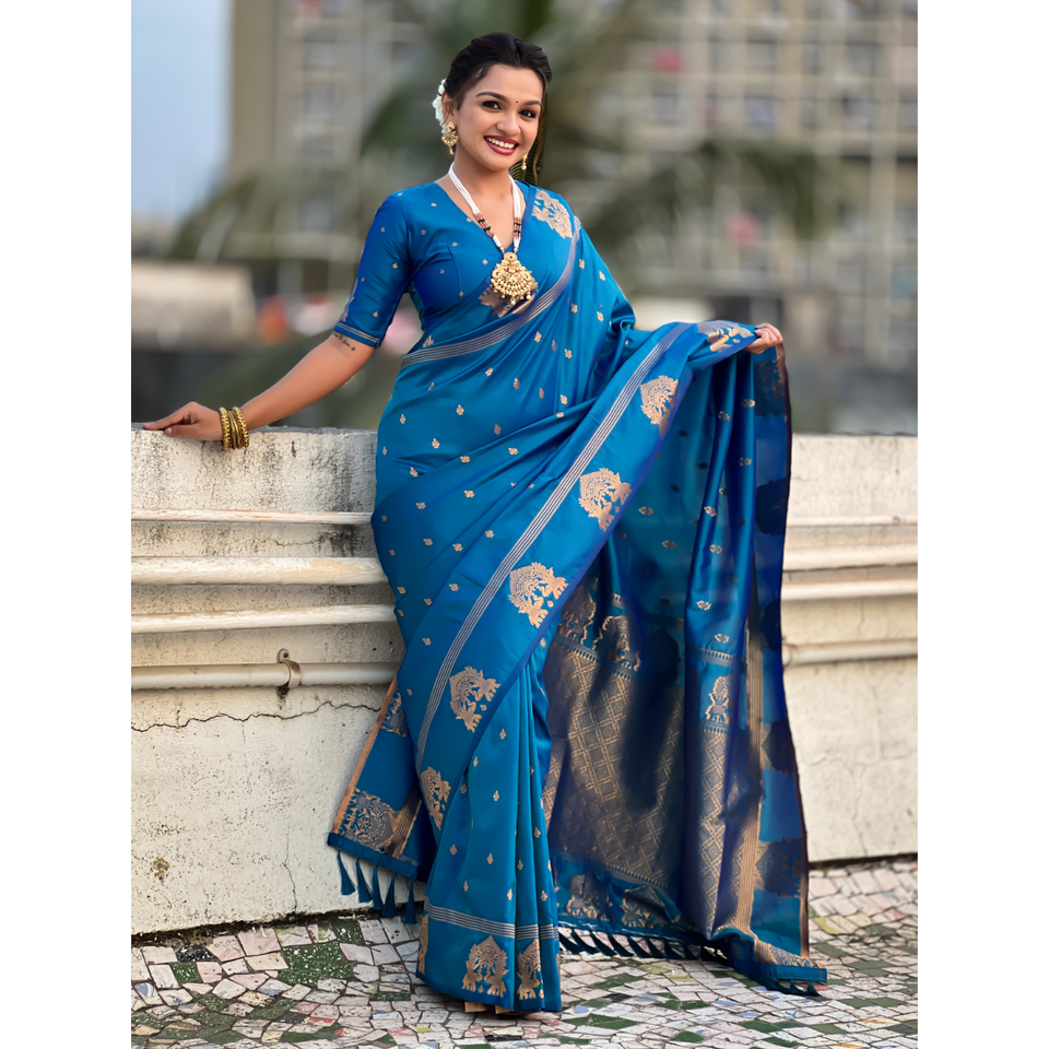 ผ้าไหมเนื้อนุ่มสีน้ำเงินลายทอแบบดั้งเดิม ซารีสำหรับงานกลางคืน น้ำหนัก 600 กรัม