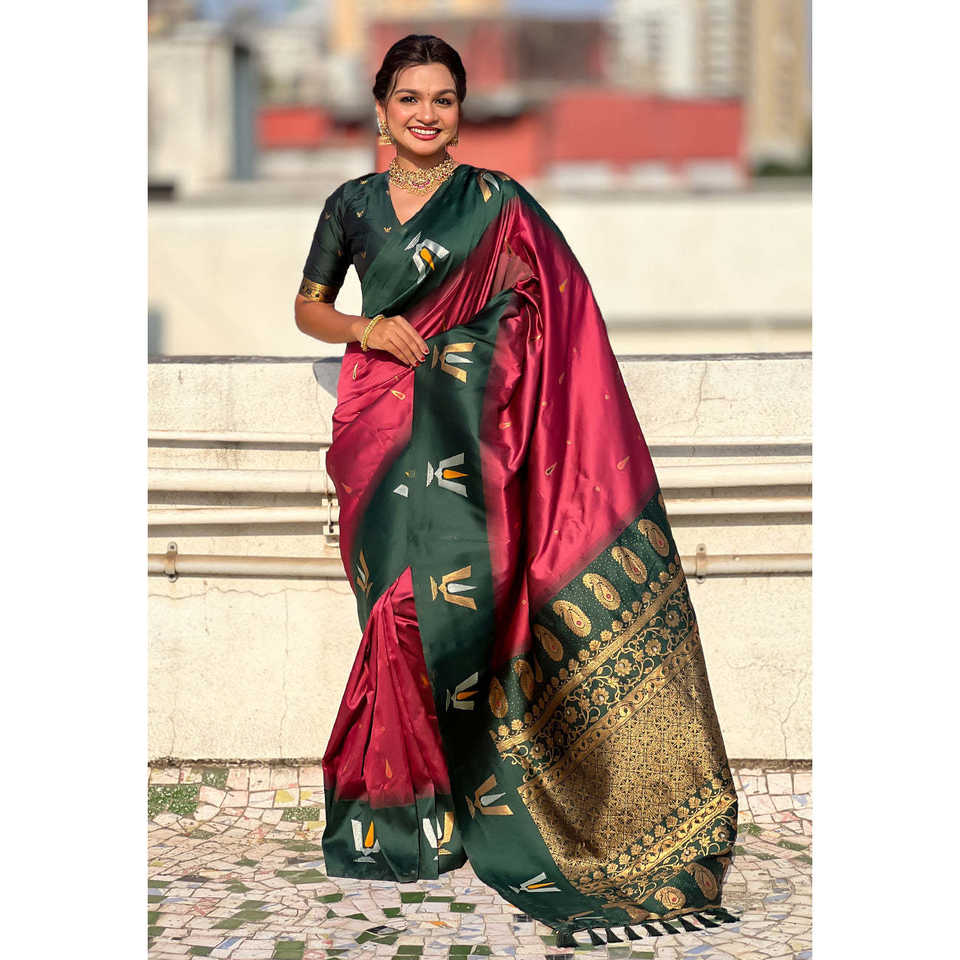 ผ้าซารีสีชมพูคอรัลแบบดั้งเดิมของอินเดียใต้ ลายติลัก ตัดกับผ้าไหมเนื้อนุ่มทอแบบซารี งานปักดิ้นทองแบบปากีสถาน