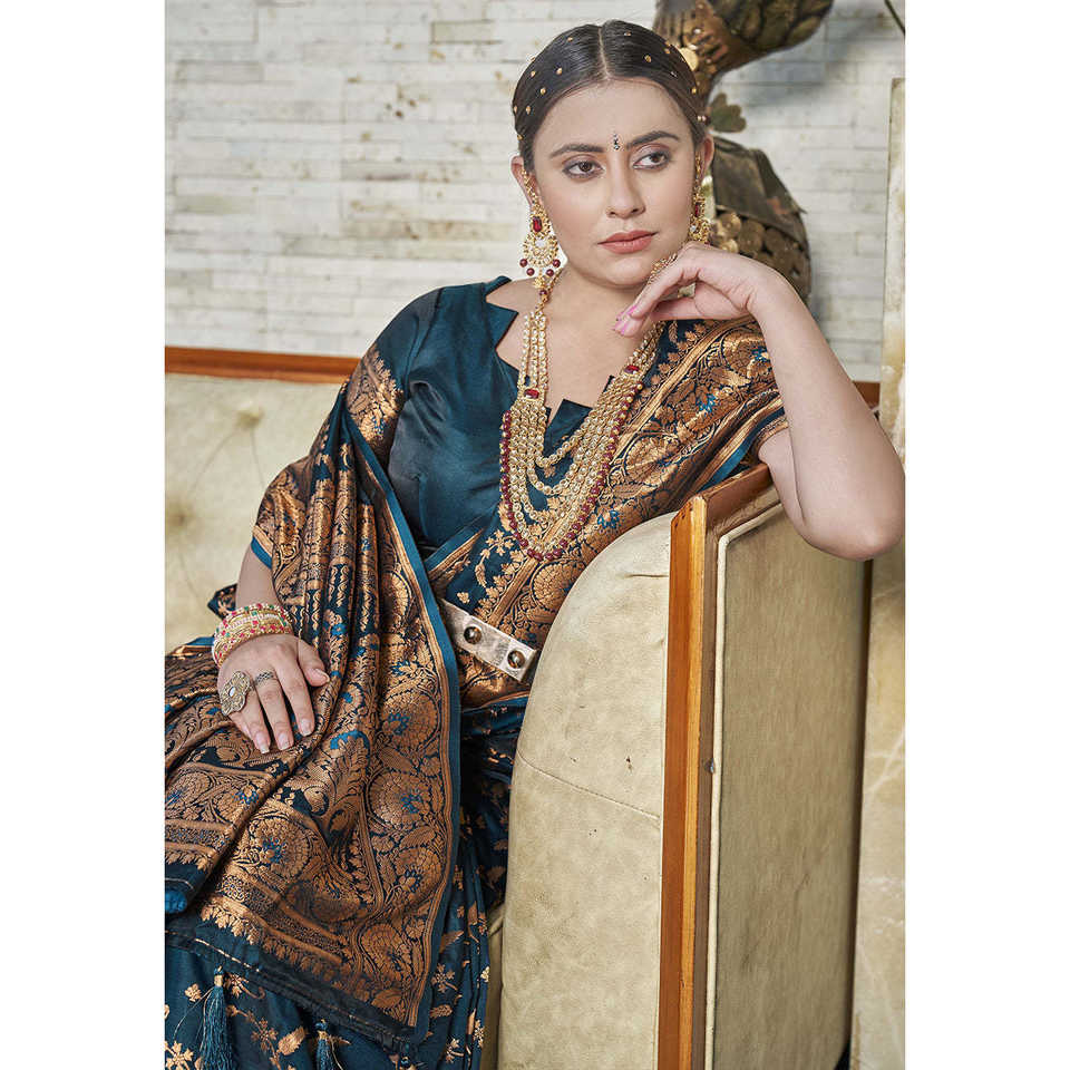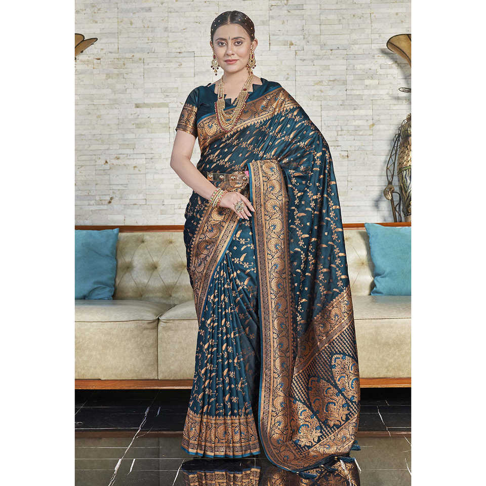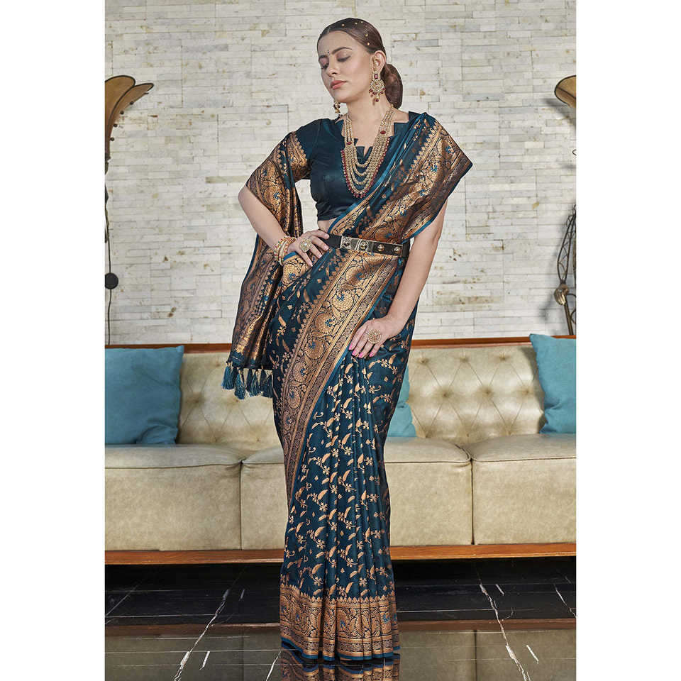 ชุดส่าหรีผ้าไหมบาเนราสี จาล คาตัน ซารีวูเวน สำหรับผู้หญิง สีน้ำเงินเข้ม ลายทอแบบเอลีท วีฟส์ พร้อมชุดซ