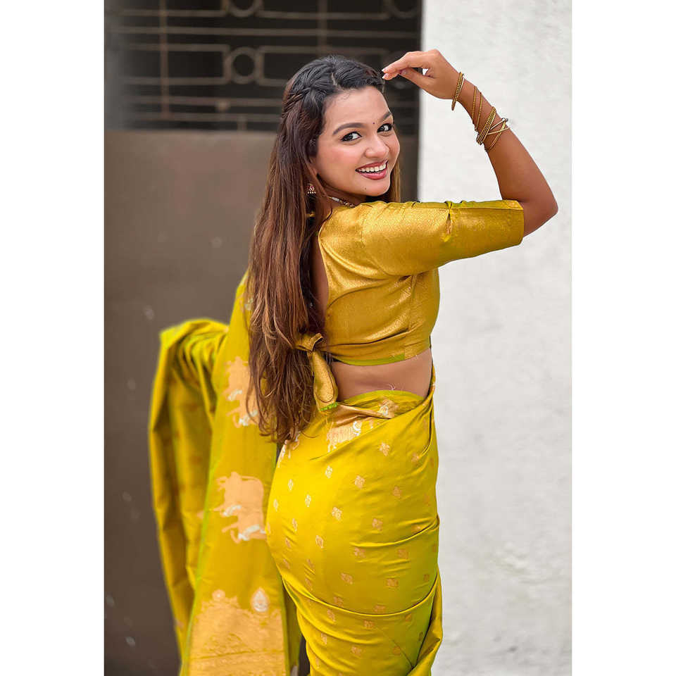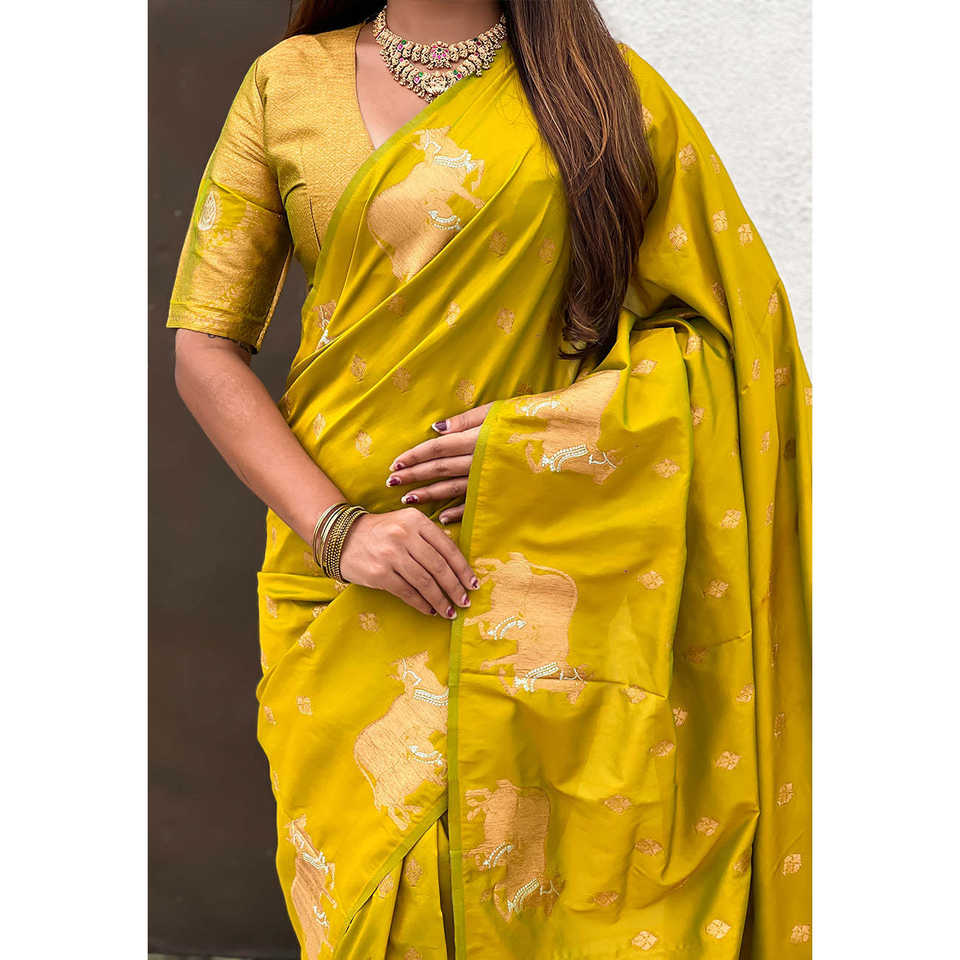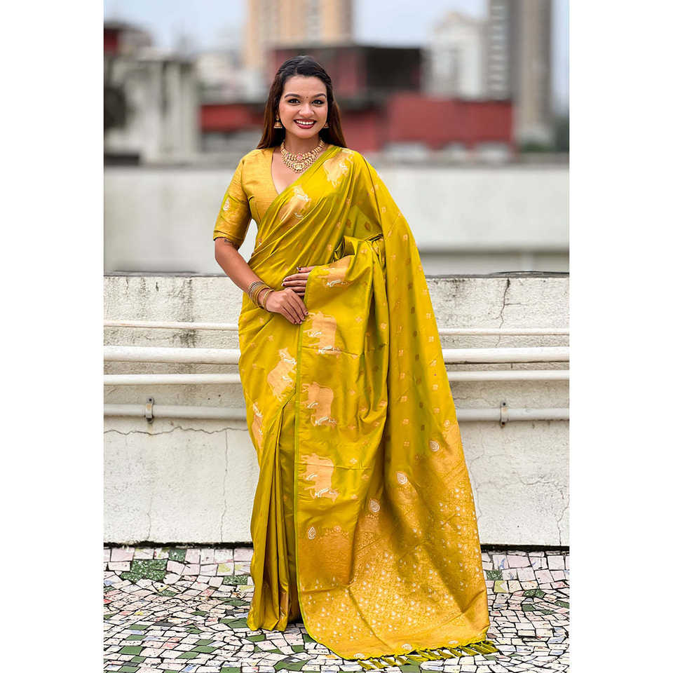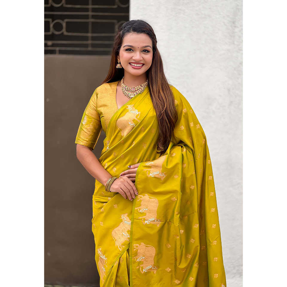 ผ้าไหมสีเขียวเนื้อนุ่มทอแบบดูอัลซาร์รี ยี่ห้ออีลิท วีฟส์ พร้อมผ้าคลุมไหล่ลายเมเฮนดีแบบนันดี บอร์เดอร์