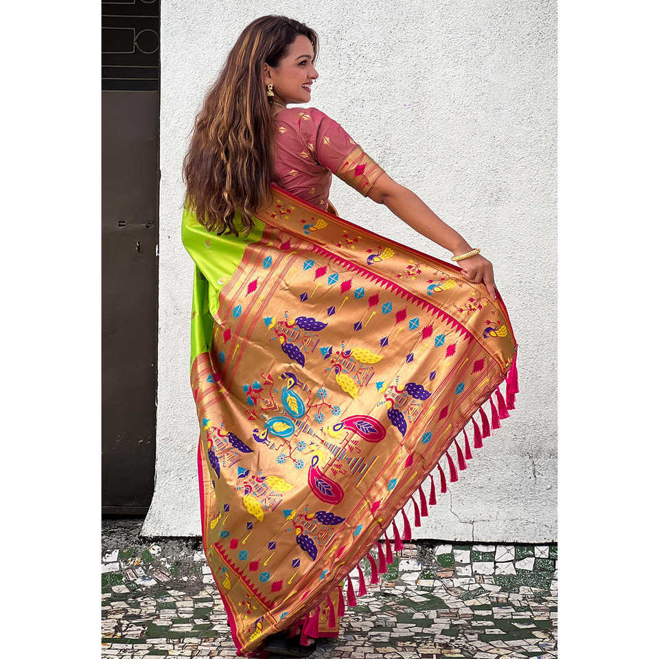 ชุดราตรีผ้าไหมชานดราคอร์สีเขียวนกแก้ว ยี่ห้ออีลิท วีฟส์ ทอประดับด้วยดิ้นทอง ลายหงส์และเยโอลา