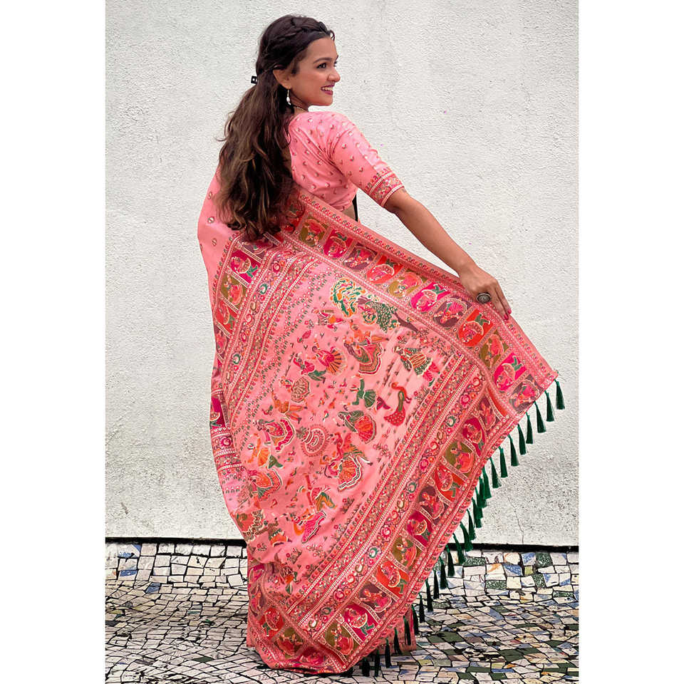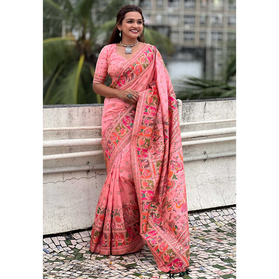 ชุดราตรีผ้าไหมแคชเมียร์สีชมพู แบรนด์ Elite Weaves พร้อมผ้าพัชมีนาและลายปักดิ้นทอง น้ำหนัก 700 กรัม