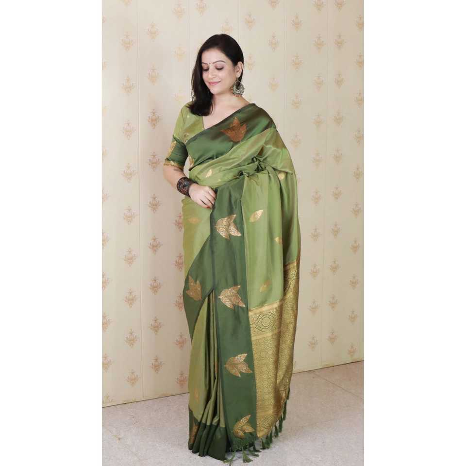 ชุดราตรีผ้าไหมสีเขียวอ่อนแบบอีลิท วีฟส์ พร้อมผ้าซารีลายดอกไม้แบบดัสตี้ คอนเซ็ปต์ ฟลอรัล ซารี ทอแบบซารี น้ำหนัก 650 กรัม