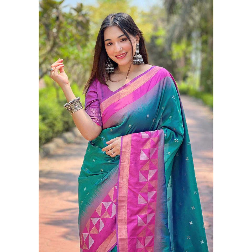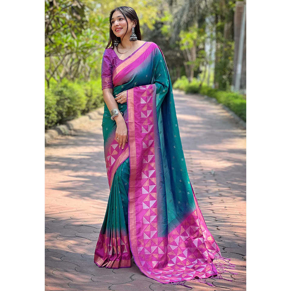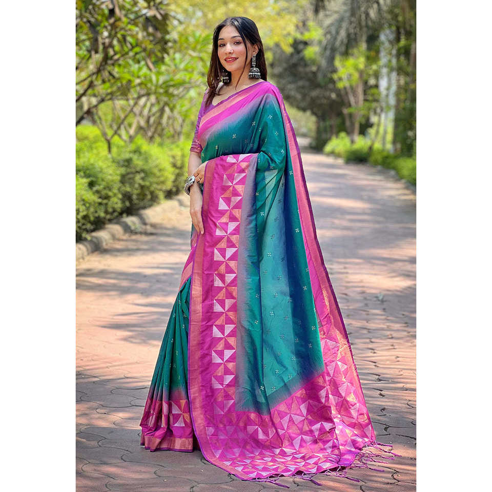 ผ้าซารีไหมสีเขียวเนื้อนุ่มลายดอกไม้ขอบประดับด้วยงานปักดิ้นทอง พร้อมชุดราตรีหรูหราที่มีดีเทลงานปักดิ้นทองตัดกัน