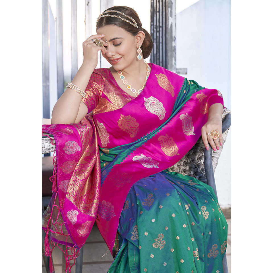Elite Weaves Green Soft Silk Saree with Zari Woven Contrast Elegant Club Dresses