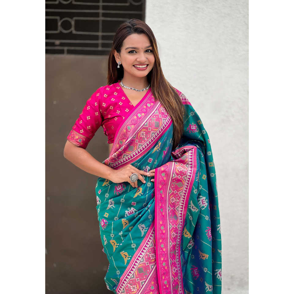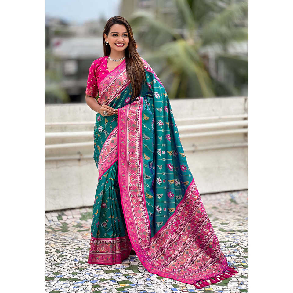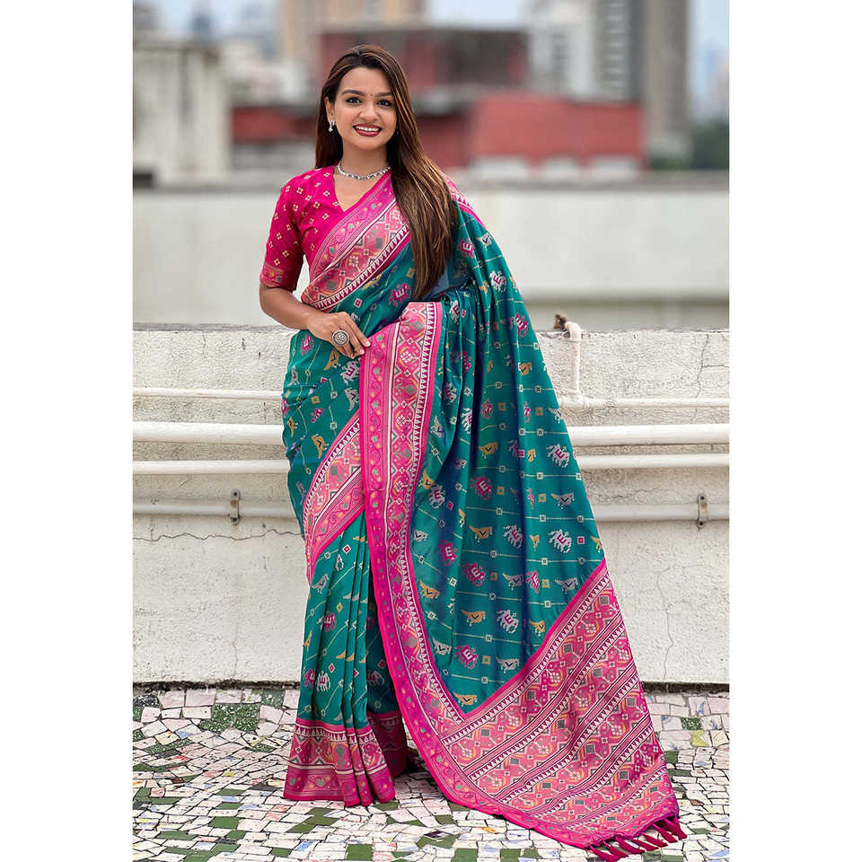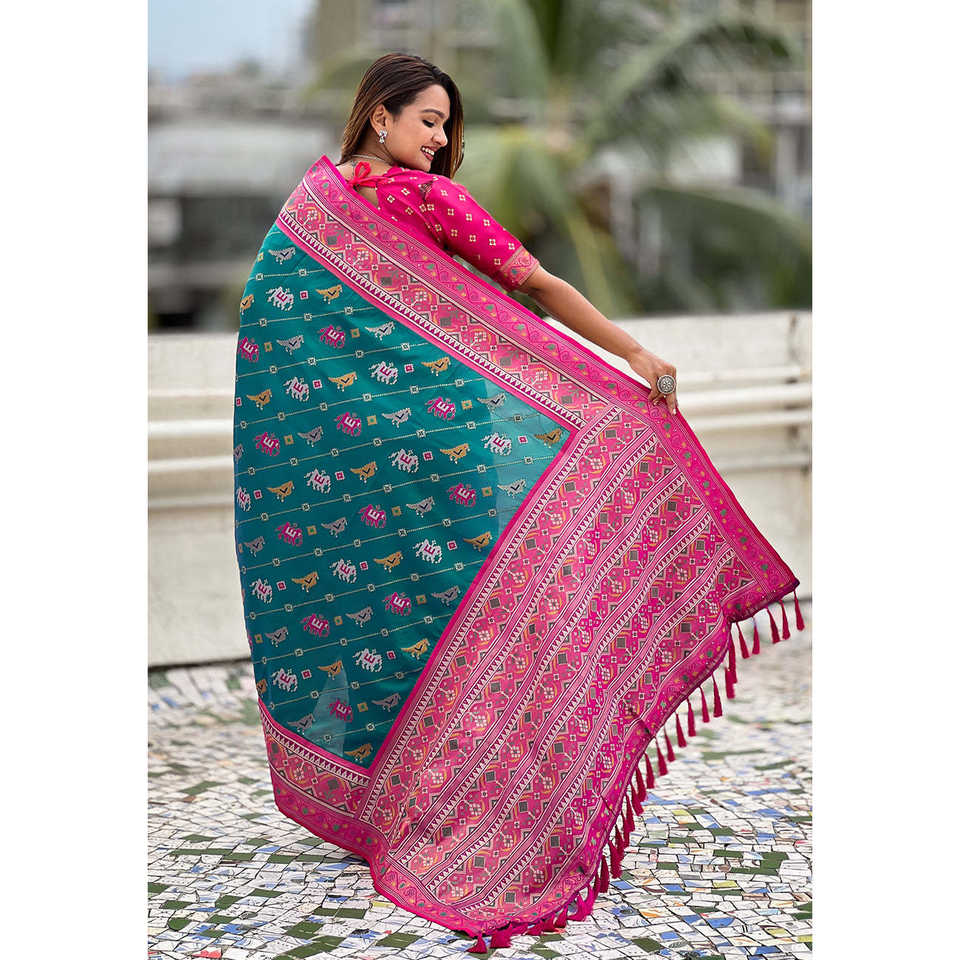 ผ้าไหมเนื้อนุ่มสีเขียวลายทอแบบ Zari ยี่ห้อ Elite Weaves รุ่น Patola Leheriya พร้อมลายทอแบบตัดกัน เสื้อผ้าอินเดียและปากีสถาน