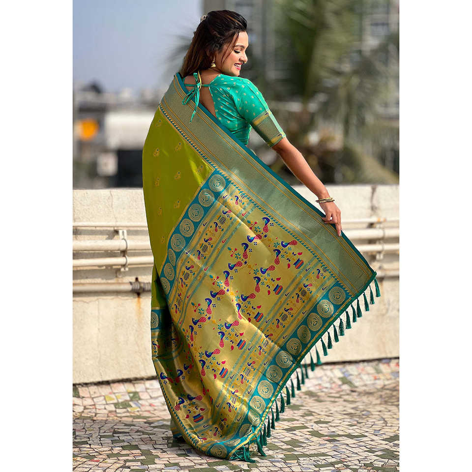 ผ้าไหมเนทเยโอล่า ปาธานี ลายเมเฮนดีสีเขียว พร้อมงานปักดิ้นทอง ผ้าไหมอินเดียคุณภาพพรีเมียม