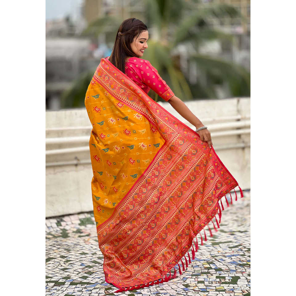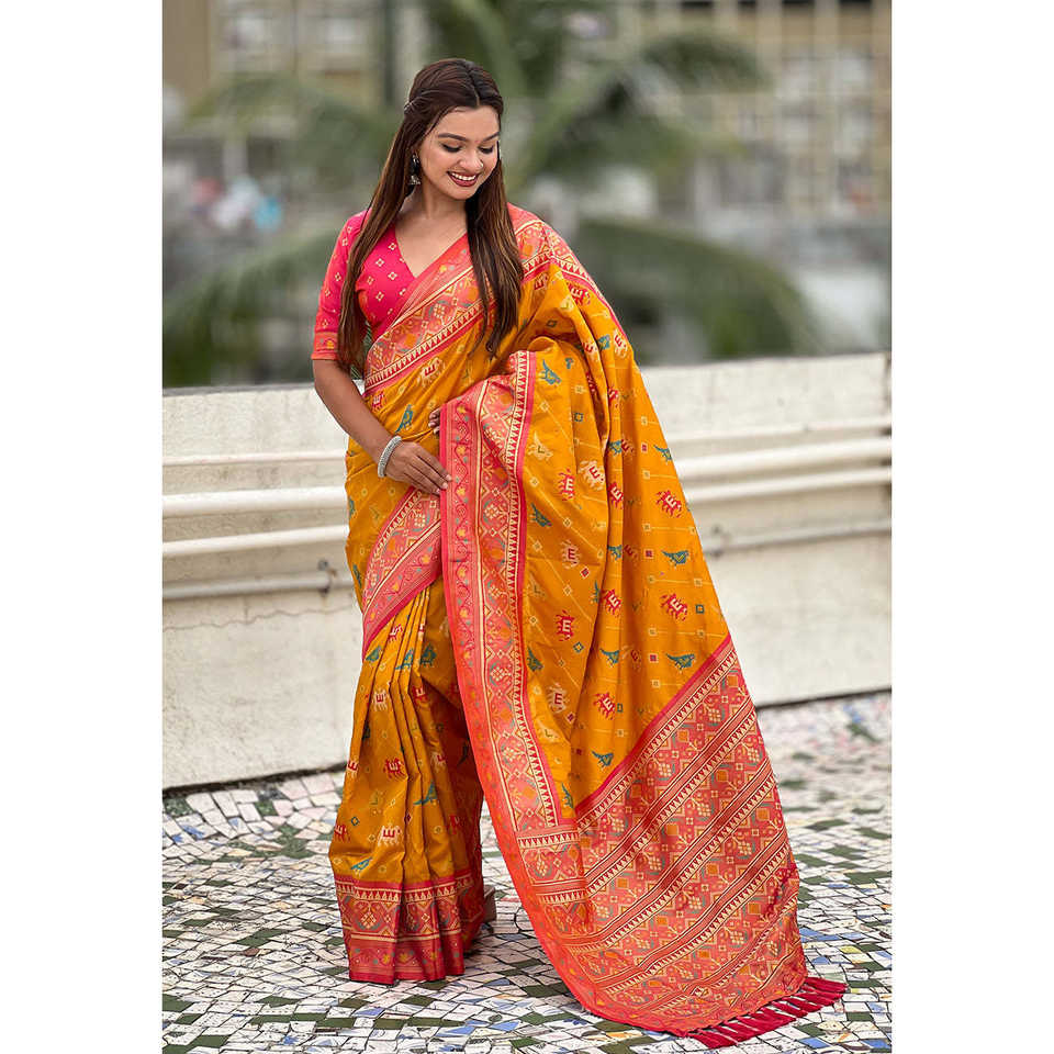 ชุดราตรีผ้าไหมเนื้อนุ่มสีมัสตาร์ด แบรนด์ Elite Weaves รุ่น Zari พร้อมผ้าปาโตลาเลเฮริยา ทอลายตัดกัน น้ำหนัก 700 กรัม มีสินค้าในสต็อก