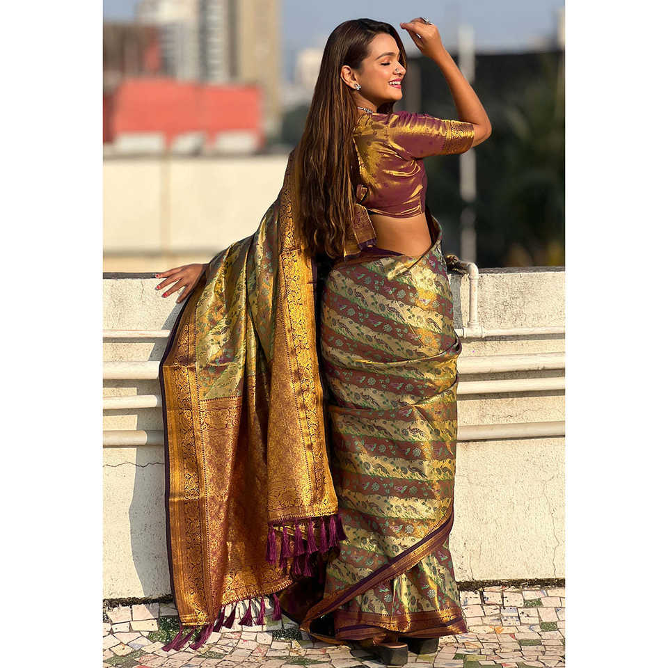 ผ้าไหมซารีทอมือลายดั้งเดิม Dharmavaram Leheriya ของ Elite Weaves ประดับด้วยดิ้นทอง ชุดราตรีสีไวน์สุดหรู