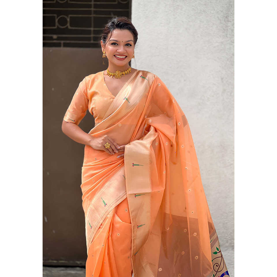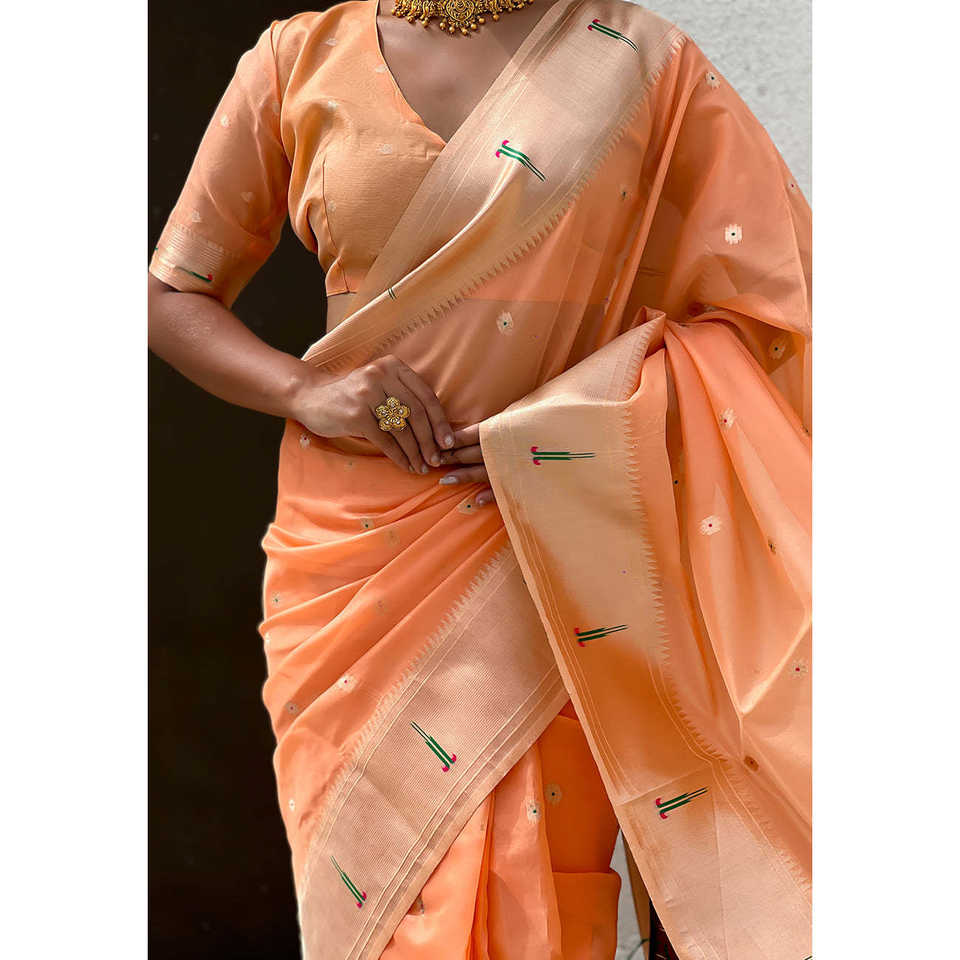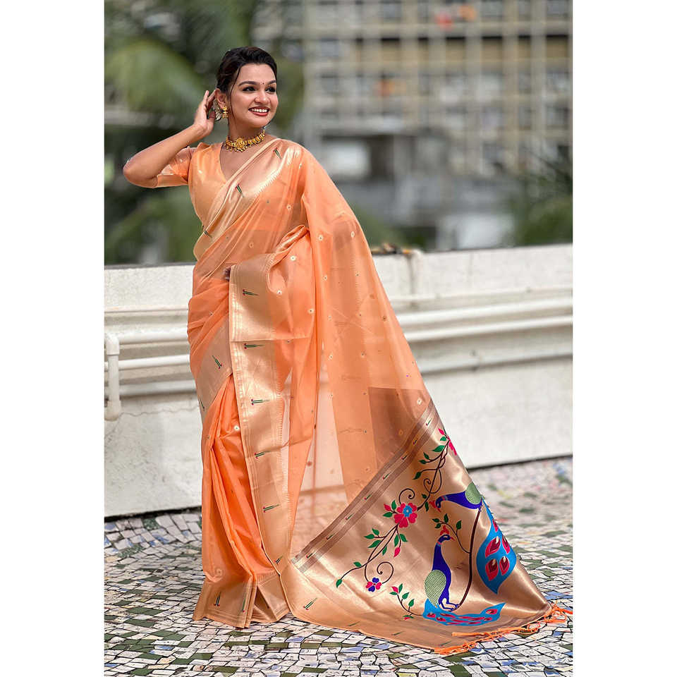 ผ้าซิ่นอินเดียแบบดั้งเดิมสุดหรูหรา ผ้าออร์แกนซ่าพีชลายปาธานี ปักดิ้นทอง สำหรับผู้หญิง