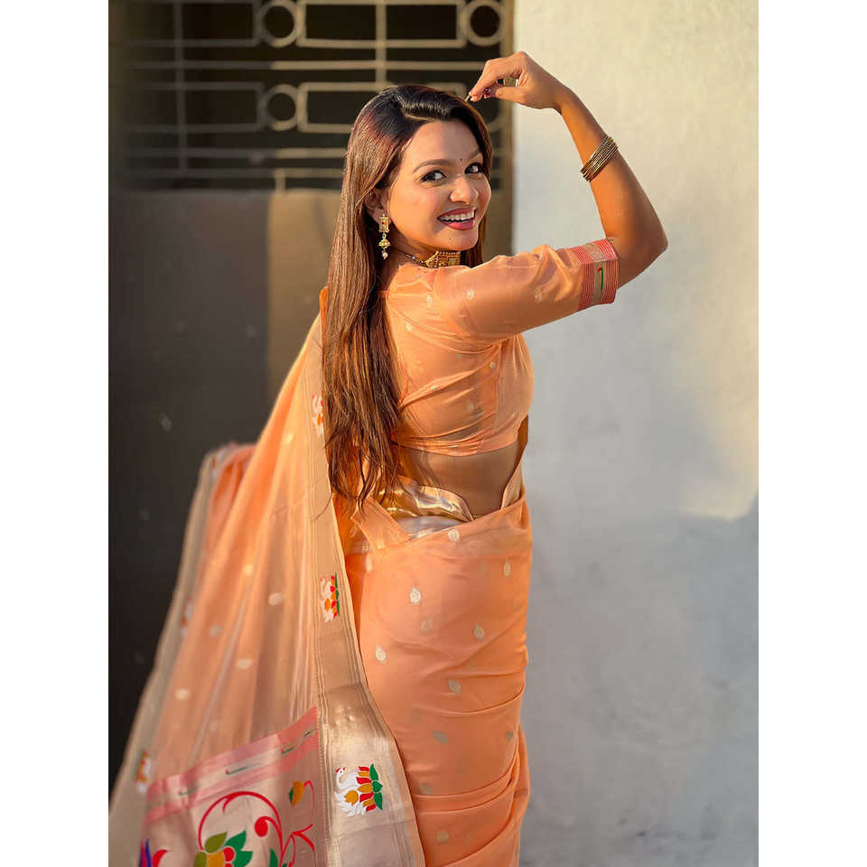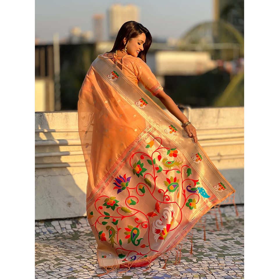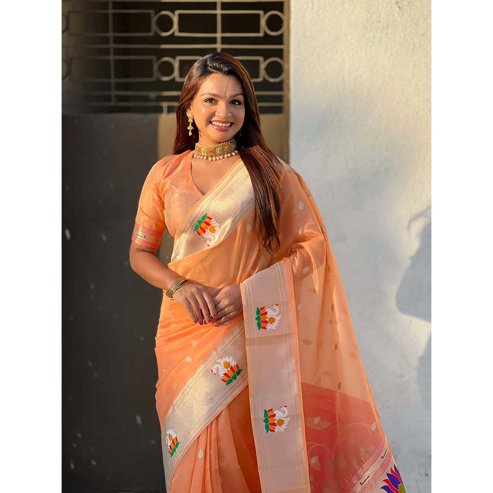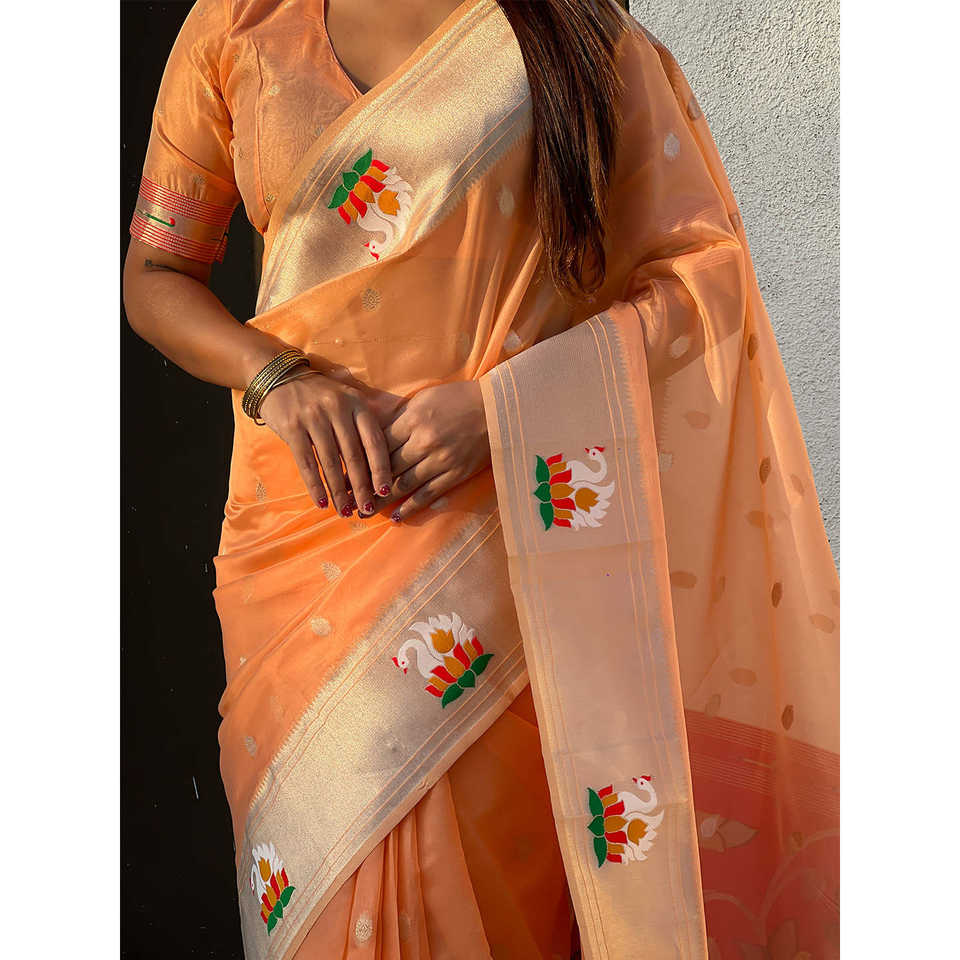 ผ้าไหมพิมพ์ลายแพทไธนีสีพีชออร์แกนซ่า ยี่ห้ออีลิท วีฟส์ น้ำหนัก 450 กรัม สำหรับงานแต่งงาน