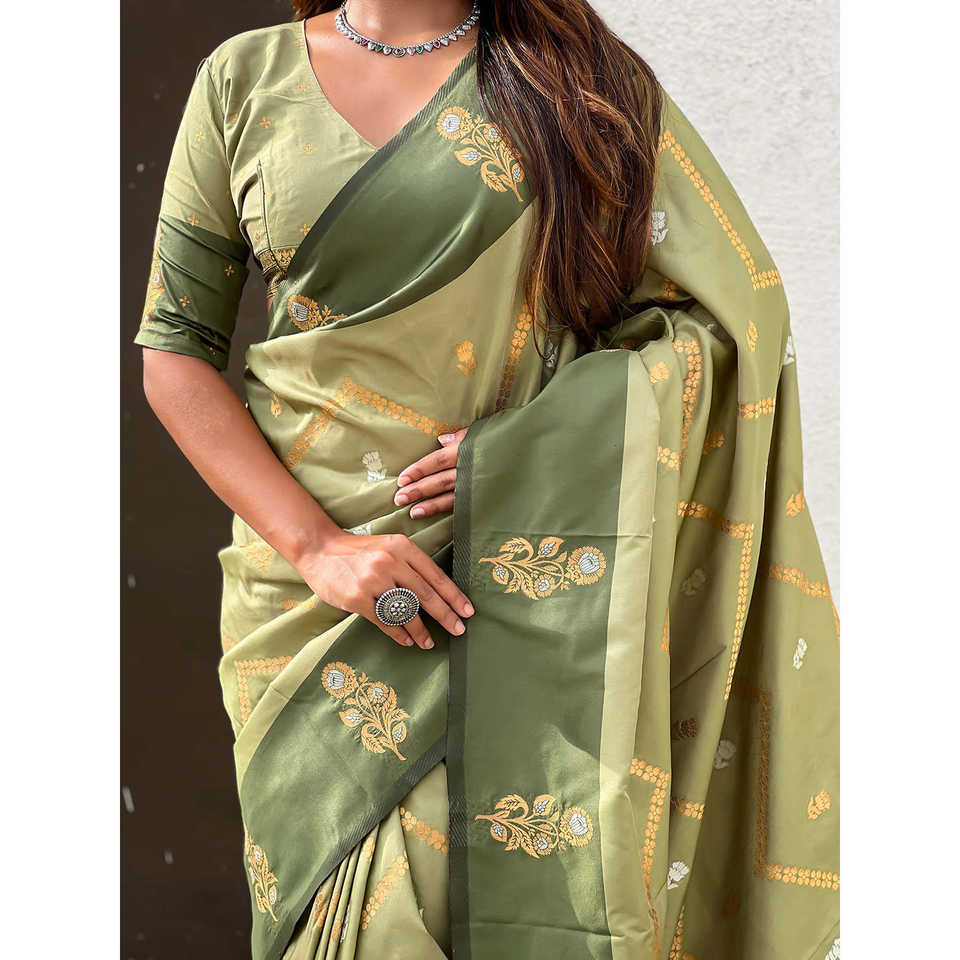 ผ้าไหมเนื้อนุ่มสีเขียวพิสตา ลายซิกแซก ประดับด้วยด้ายซารี งานทอแบบดั้งเดิม ชุดราตรีหรูหรา