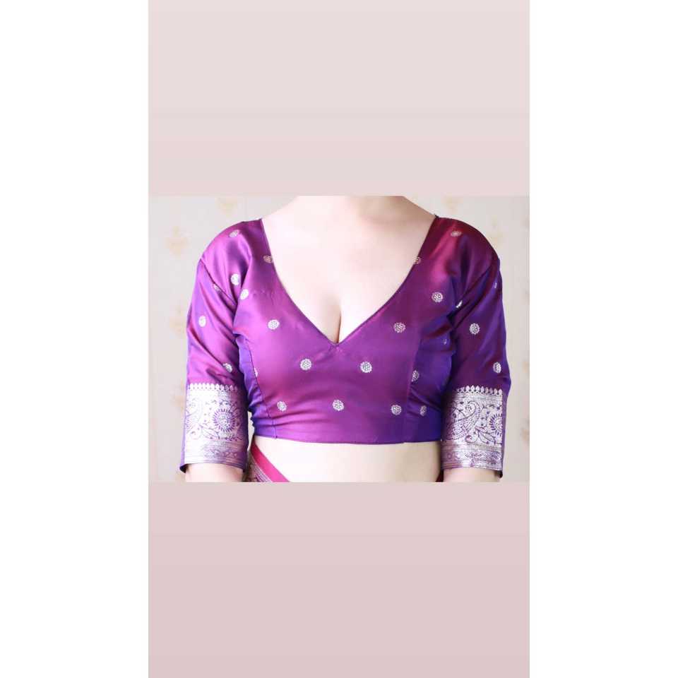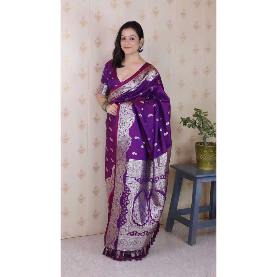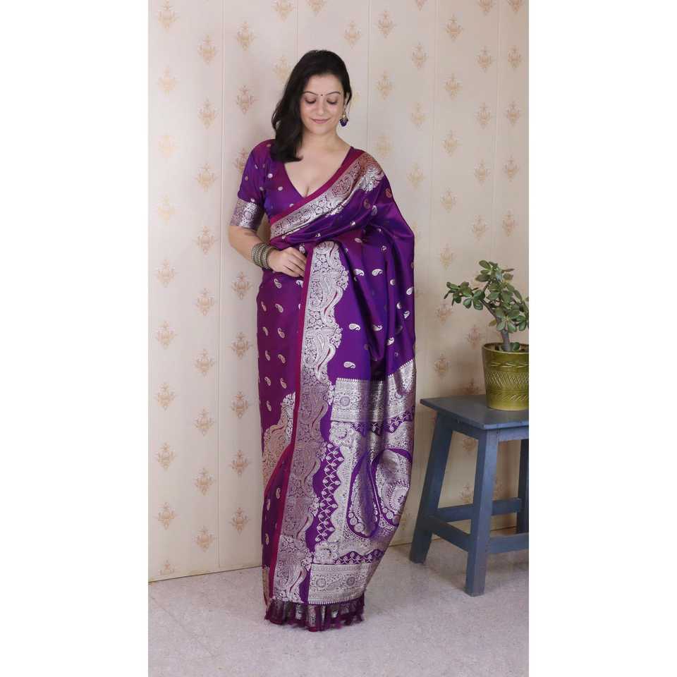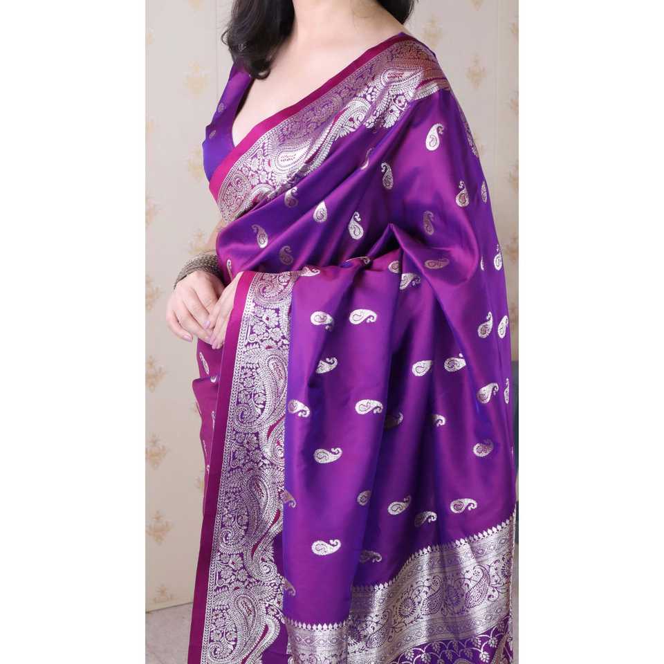 ผ้าไหมเนื้อนุ่มสีม่วงลายทอแบบอินเดีย/ปากีสถาน ยี่ห้อ Elite Weaves รุ่น Banarasi ประดับด้วยดิ้นเงิน สำหรับงานเลี้ยงฤดูหนาว เหมาะสำหรับผู้หญิง น้ำหนัก 650 กรัม