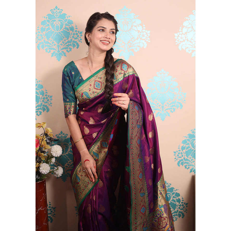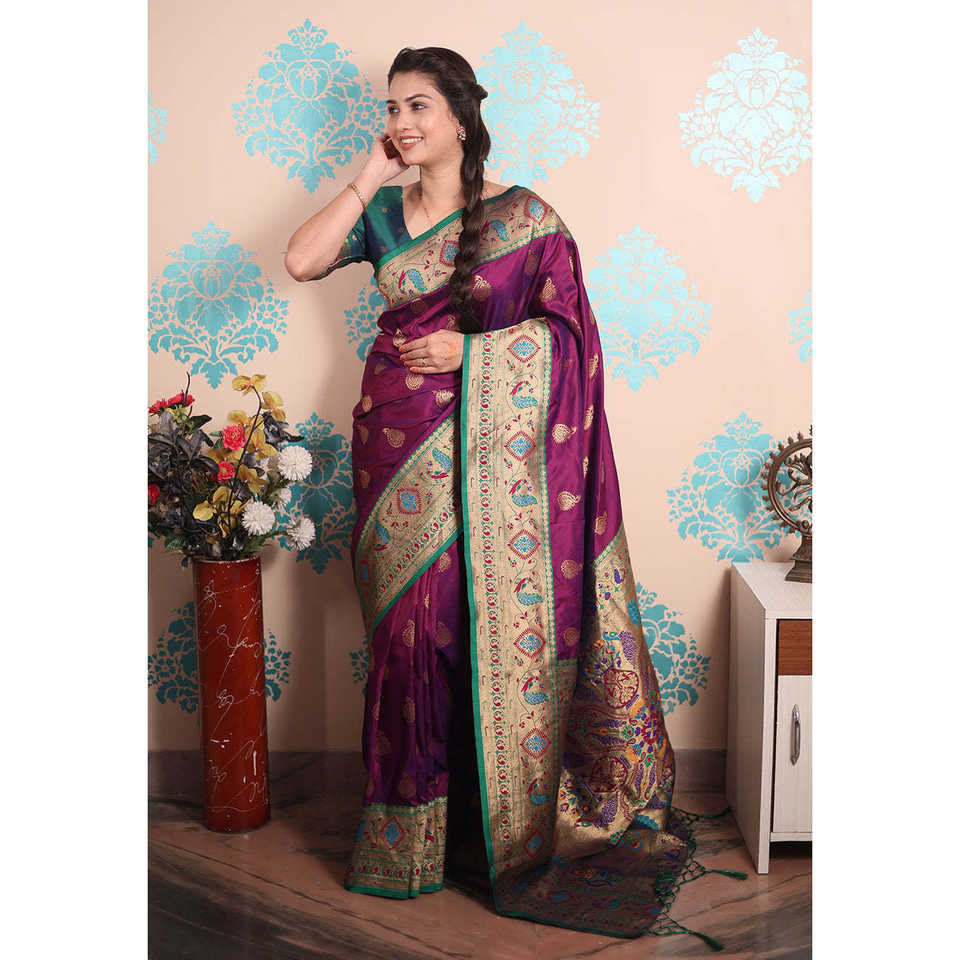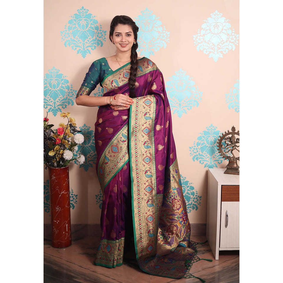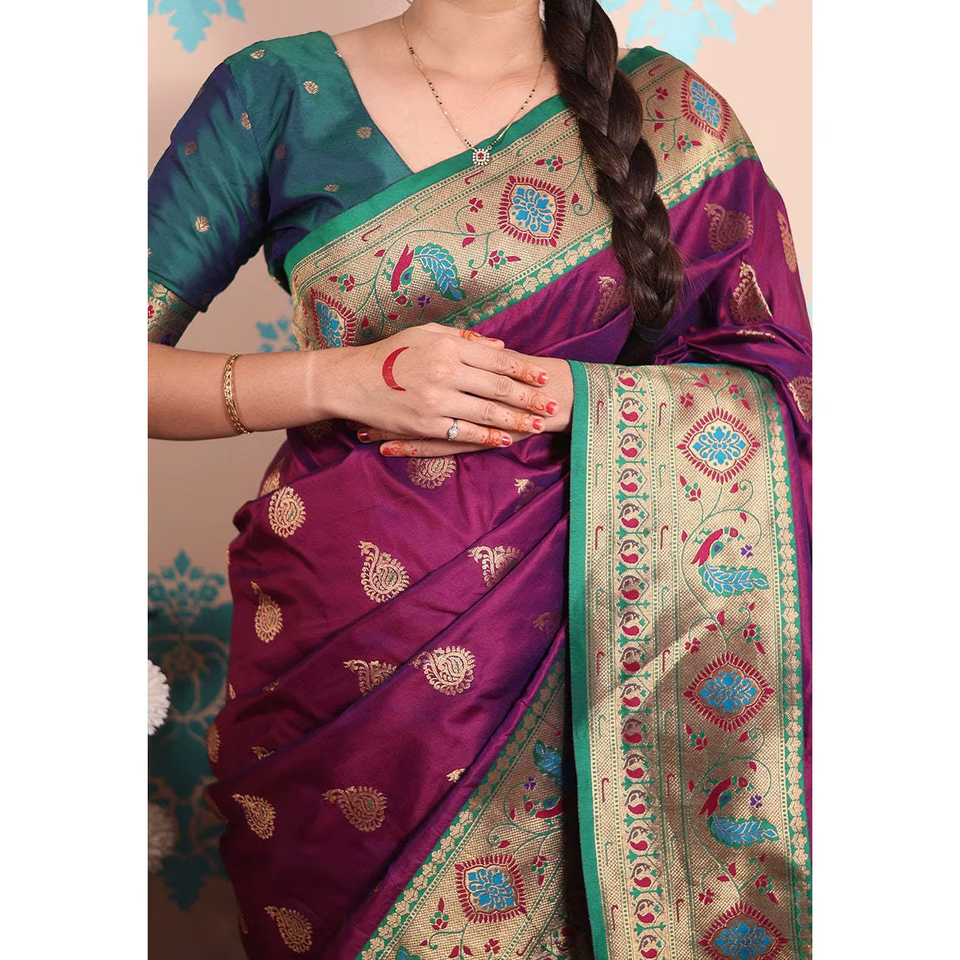ผ้าไหมพิธาไนสีม่วงลายวีฟ ผ้าไหมทอสีม่วงลายวีฟ น้ำหนัก 650 กรัม เสื้อผ้าอินเดียและปากีสถาน