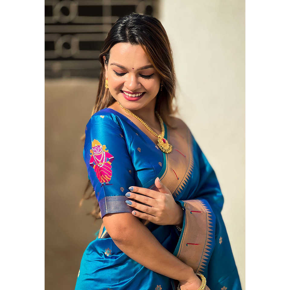 ผ้าไหมพิธานีสีน้ำเงินลายรามะ งานทอซารีแบบดั้งเดิม ผ้าไหมวิททาลา ชุดพิธีกรรมอินเดียและปากีสถาน น้ำหนัก 650 กรัม